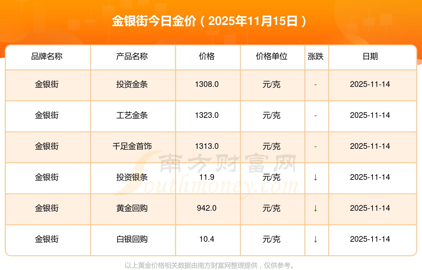 金银街现在金价多少钱一克?金银街今天工艺金条价格多少一克?最新金银街查询,2025年11月15日金银街工艺金条现在每克多少钱?最新金银街工艺金条报价公布,一起来看看吧!
