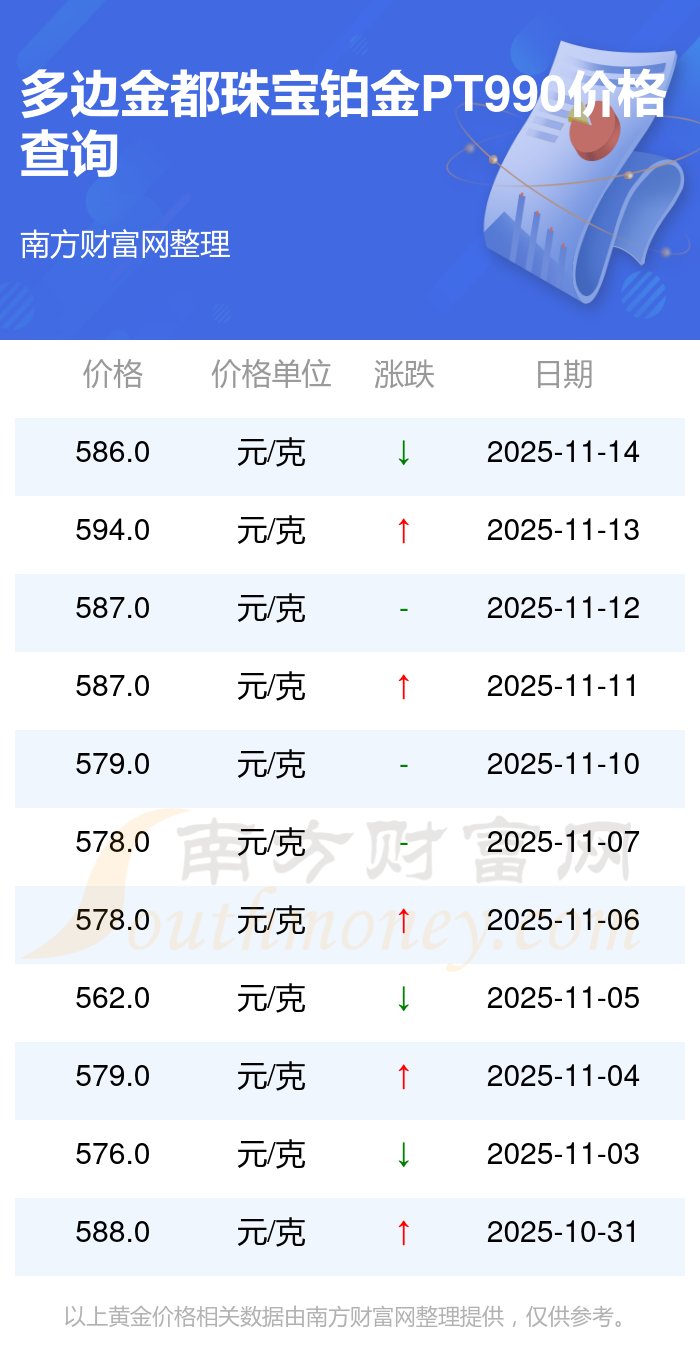 2025年11月15日多边金都珠宝铂金PT990价格:586.0元/克。