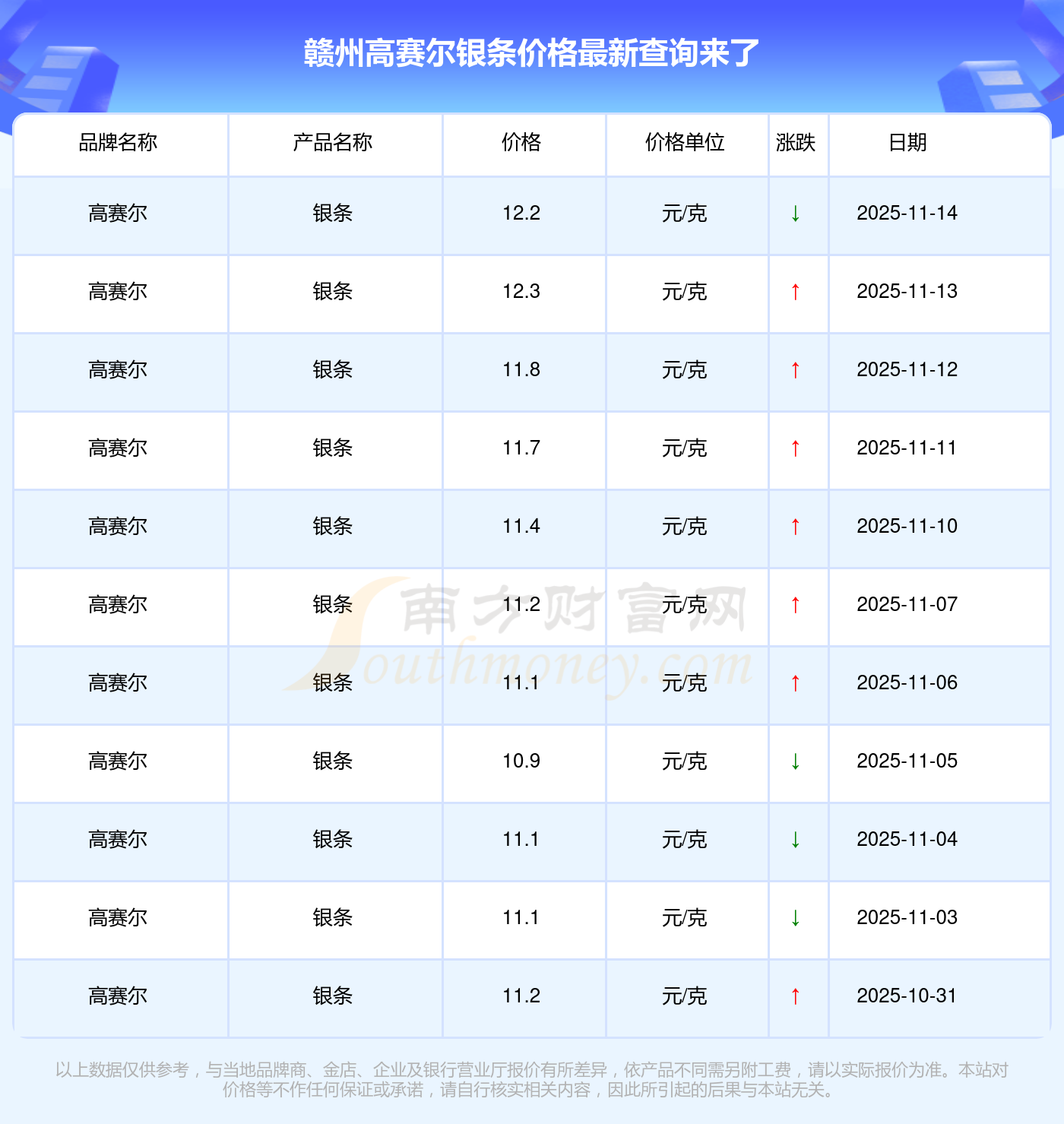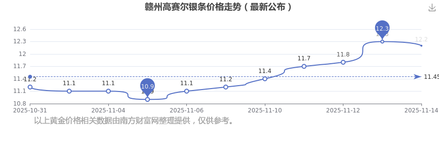 赣州高赛尔 2025年11月15日的银条价位为 12.2元/克。