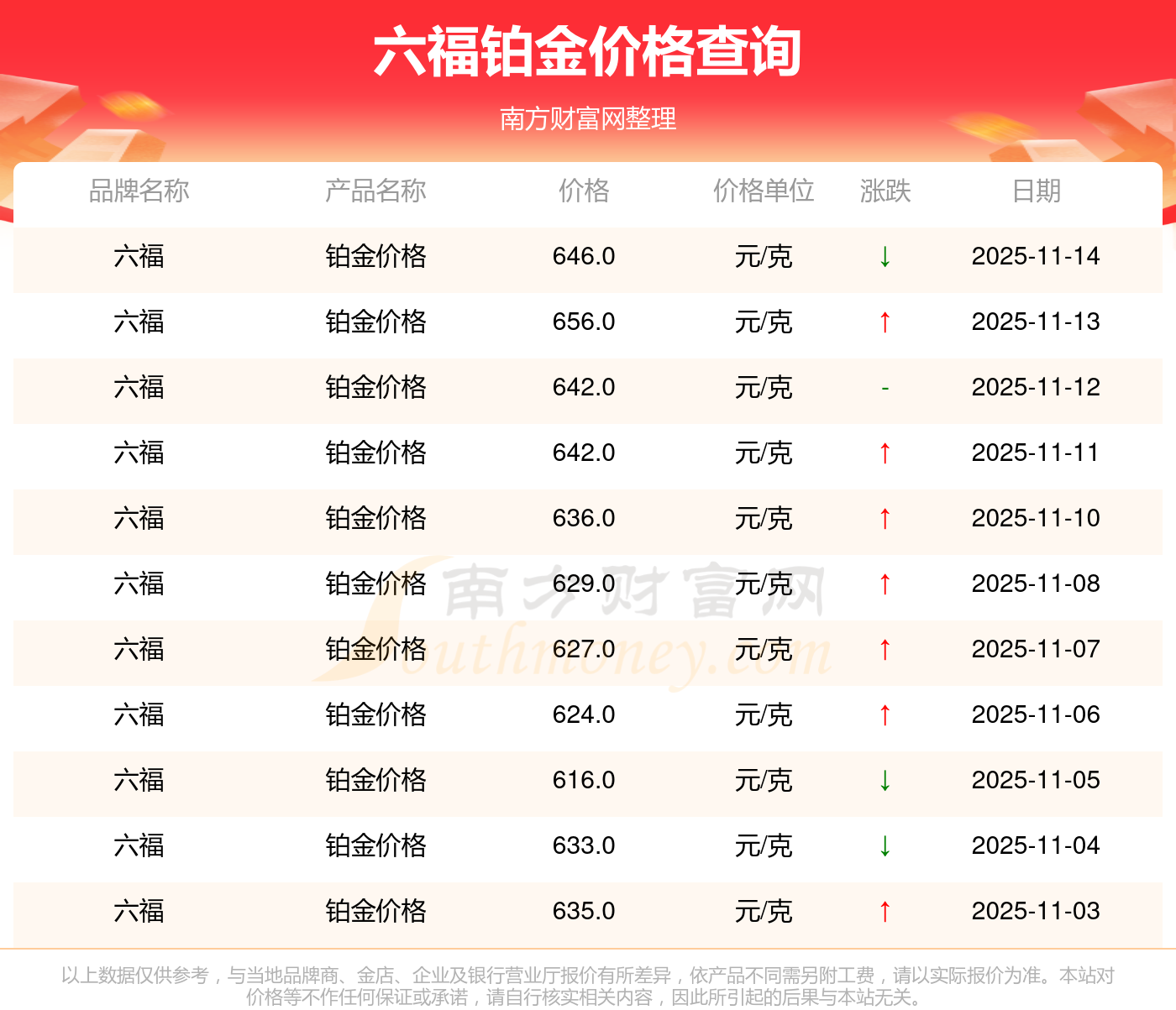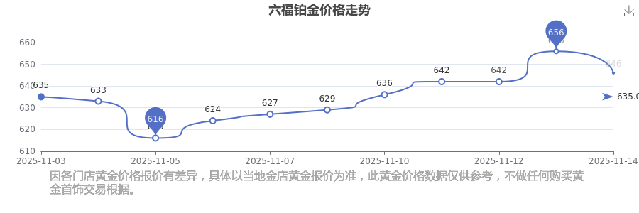 646.0元/克的价格,是六福今日 铂金价格的最新行情。