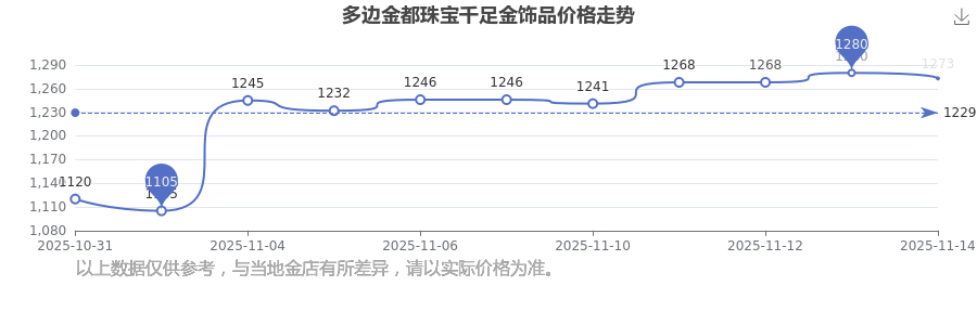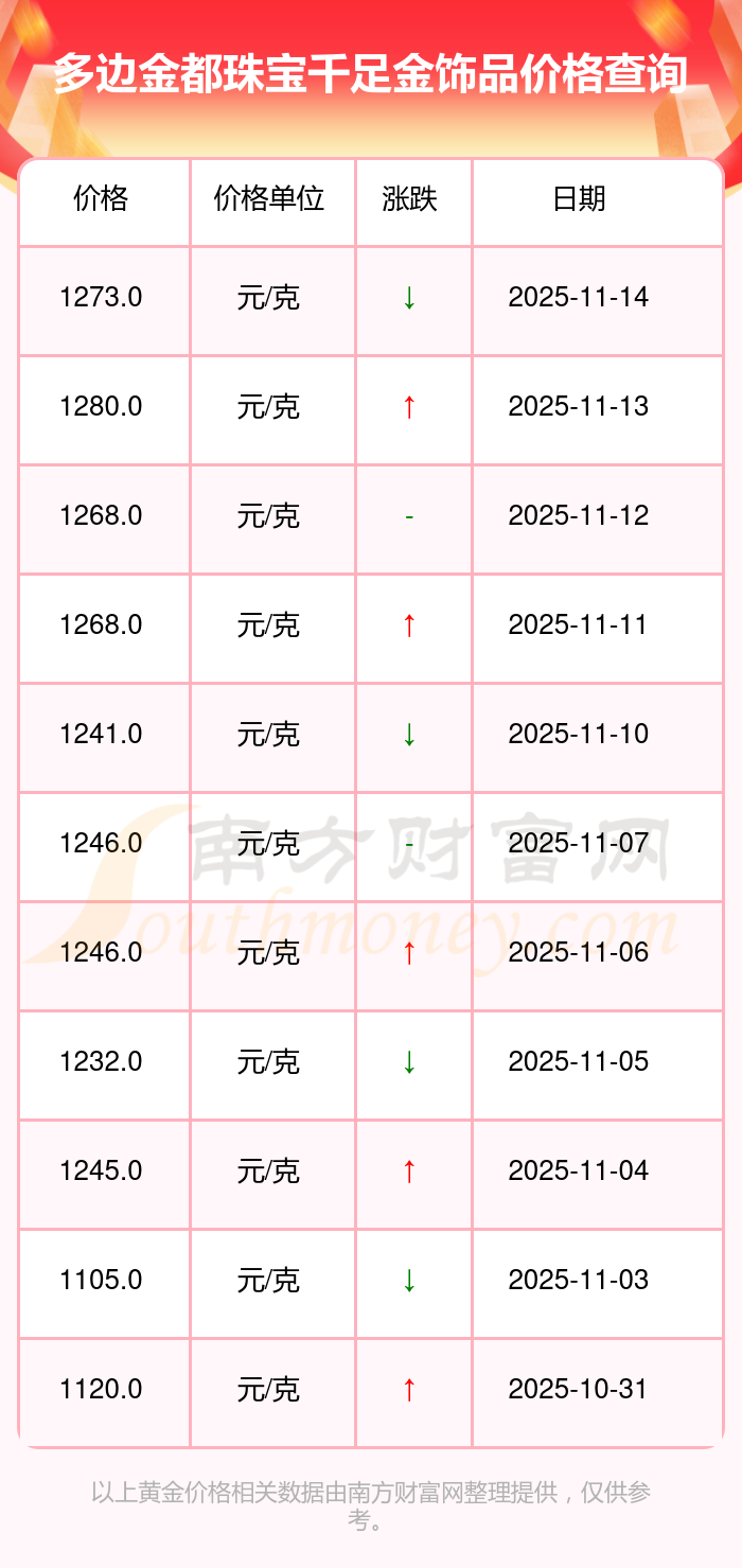 今日(2025年11月15日)多边金都珠宝千足金饰品价格为1273.0元/克。