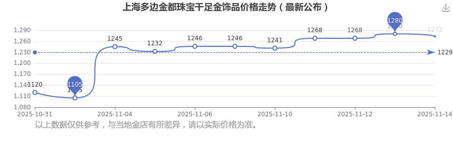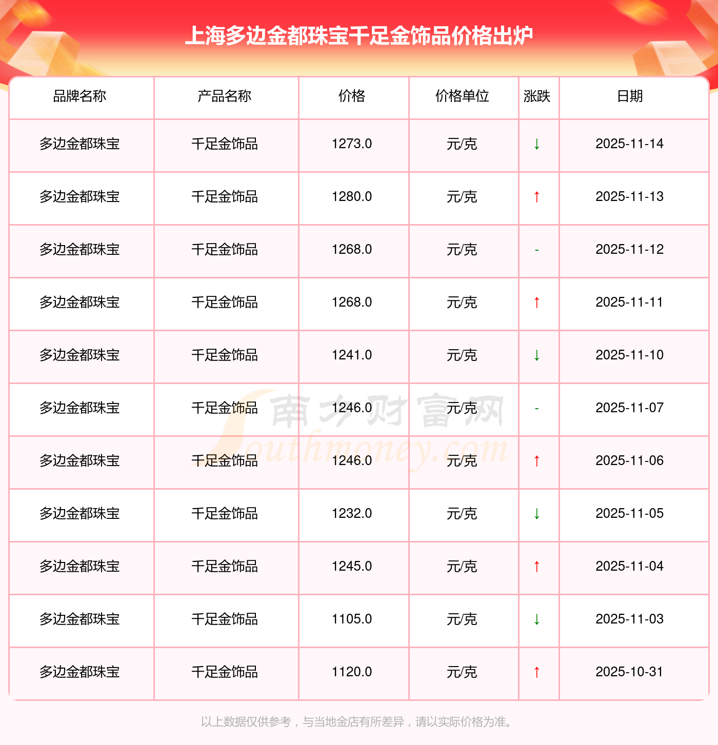 2025年11月15日,上海多边金都珠宝的千足金饰品标价达到 1273.0元/克。
