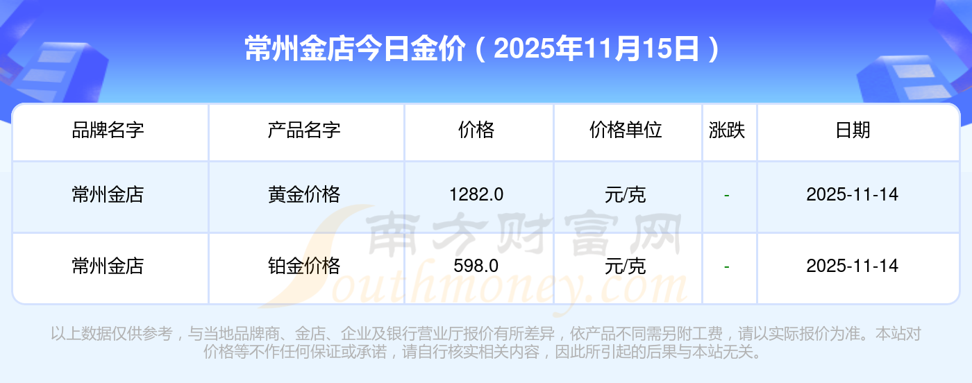 常州金店现在金价多少钱一克?常州金店今天黄金价格多少一克?最新常州金店查询,2025年11月15日常州金店黄金价格现在每克多少钱?最新常州金店黄金价格报价公布,一起来看看吧!