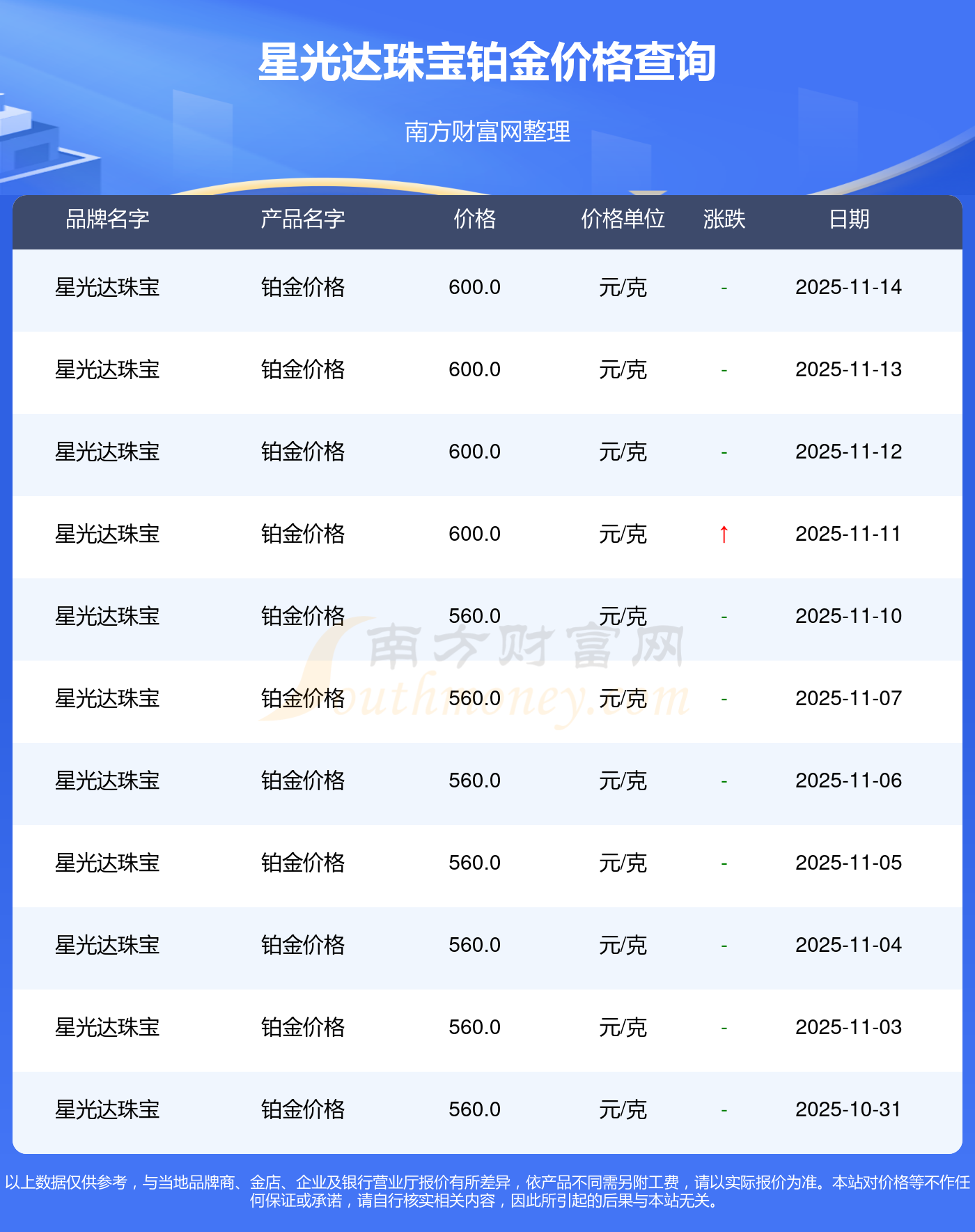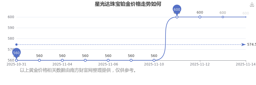 星光达珠宝 铂金价格在今日的最新价格显示为600.0元/克。