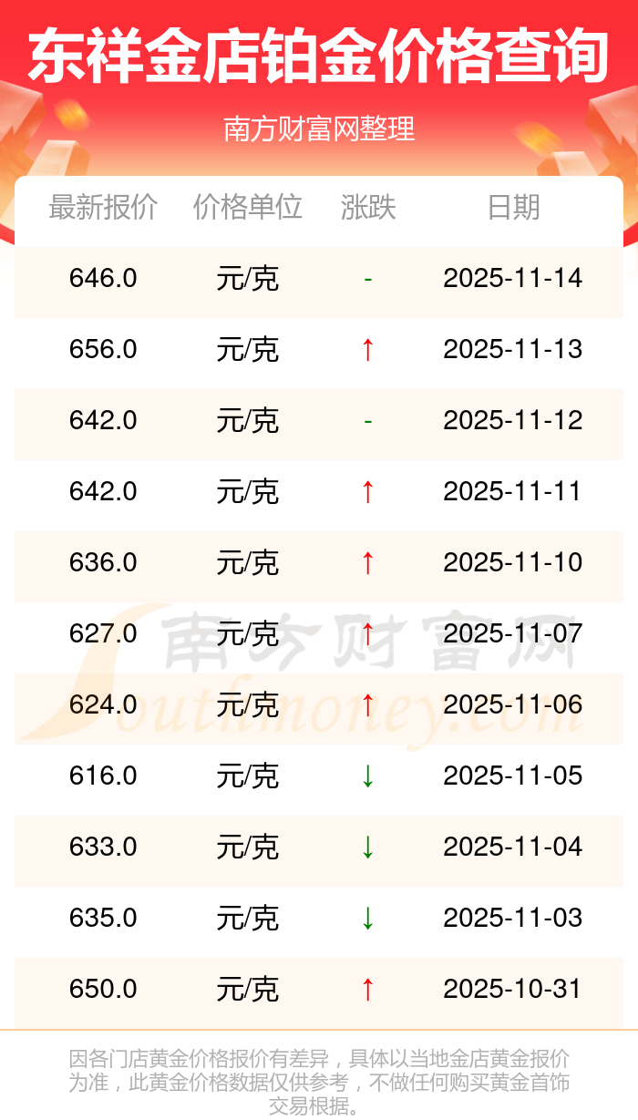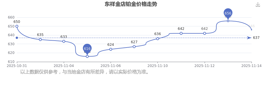 今日(2025年11月15日),东祥金店铂金价格最新价格是646.0元/克。