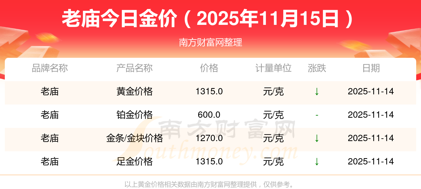 2025年11月15日,周大福、周大福、周大福、周大福、周大福、周大福、周大福、老凤祥、老凤祥、老凤祥、周六福等各大金店品牌黄金价格今日价格如下:周大福1333.0元/克、周大福646.0元/克、周大福1333.0元/克、周大福46320.0、周大福18410.0、周大福41780.0、周大福1167.0元/克、老凤祥1322.0元/克、老凤祥600.0元/克、老凤祥1322.0元/克、周六福1295.0元/克。