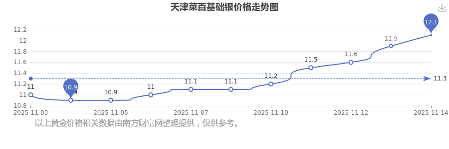 2025年11月15日,天津菜百的基础银价标价达到 12.1元/克。