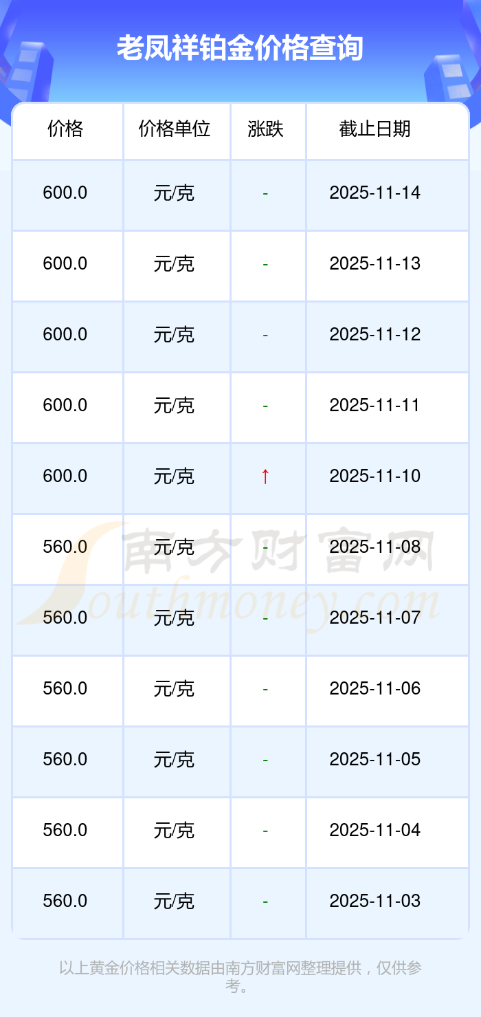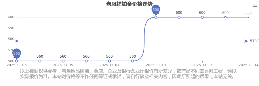 老凤祥 铂金价格于今日的最新挂牌价为600.0元/克。