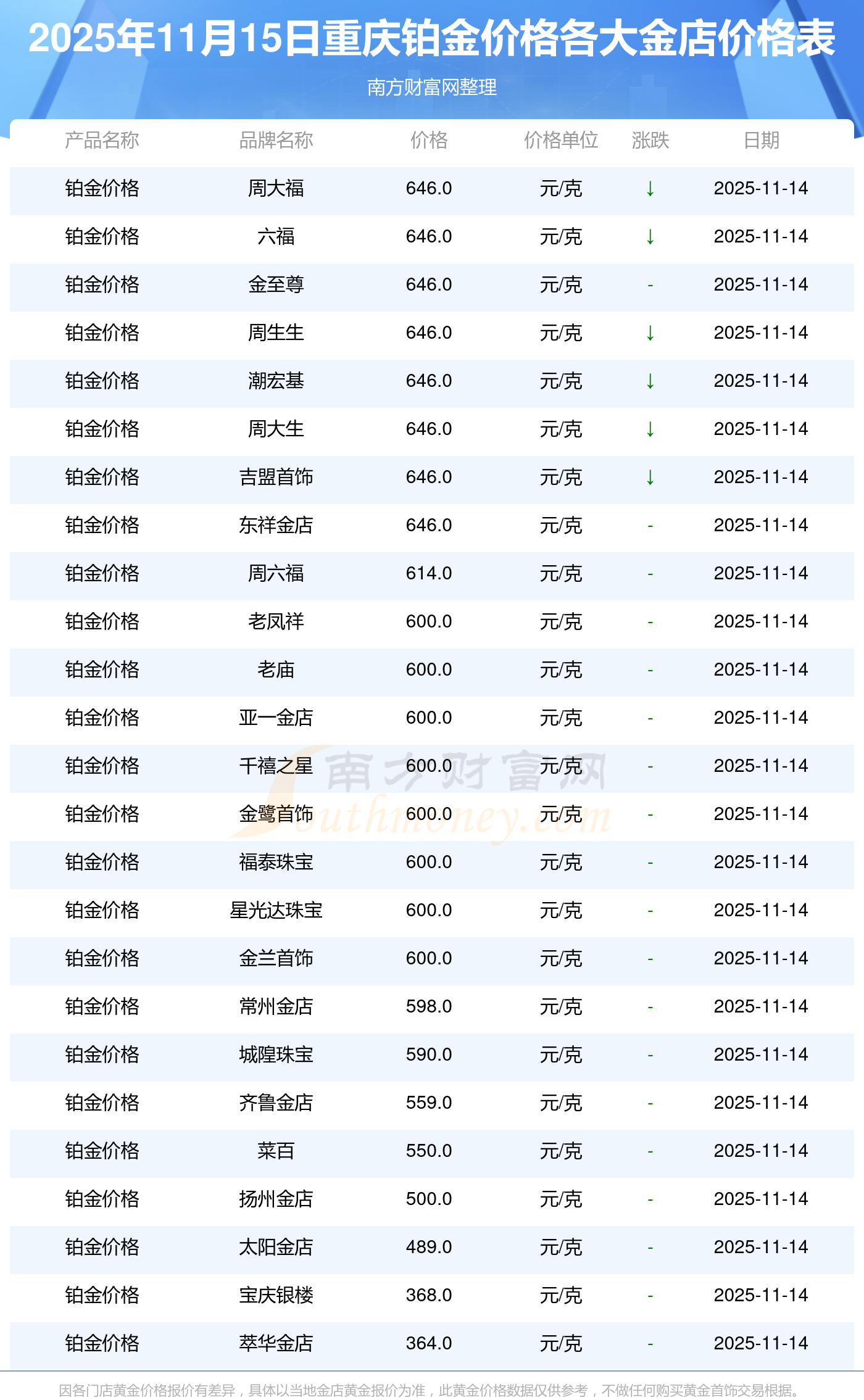 2025年11月15日重庆周大福、周大福、周大福、周大福、周大福、周大福、周大福、老凤祥、老凤祥、老凤祥、周六福等各大金店品牌铂金价格最新价格如下:周大福黄金价格1333.0元/克,周大福铂金价格646.0元/克,周大福饰品金价(内地)1333.0元/克,周大福黄金饰品(香港)46320.0,周大福铂金价格(香港)18410.0,周大福金条价格(香港)41780.0,周大福金条金价(内地)1167.0元/克,老凤祥黄金价格1322.0元/克,老凤祥铂金价格600.0元/克,老凤祥足金价格1322.0元/克,周六福黄金价格1295.0元/克。