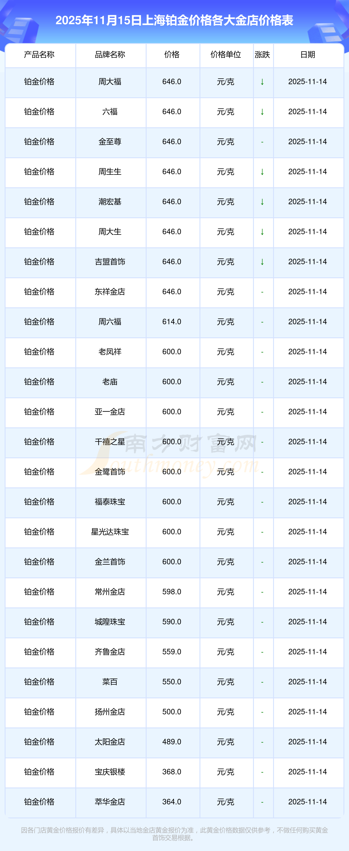 2025年11月15日,上海周大福、周大福、周大福、周大福、周大福、周大福、周大福、老凤祥、老凤祥、老凤祥、周六福等各大金店品牌铂金价格今日价格行情最新来了:周大福1333.0元/克、周大福646.0元/克、周大福1333.0元/克、周大福46320.0、周大福18410.0、周大福41780.0、周大福1167.0元/克、老凤祥1322.0元/克、老凤祥600.0元/克、老凤祥1322.0元/克、周六福1295.0元/克。