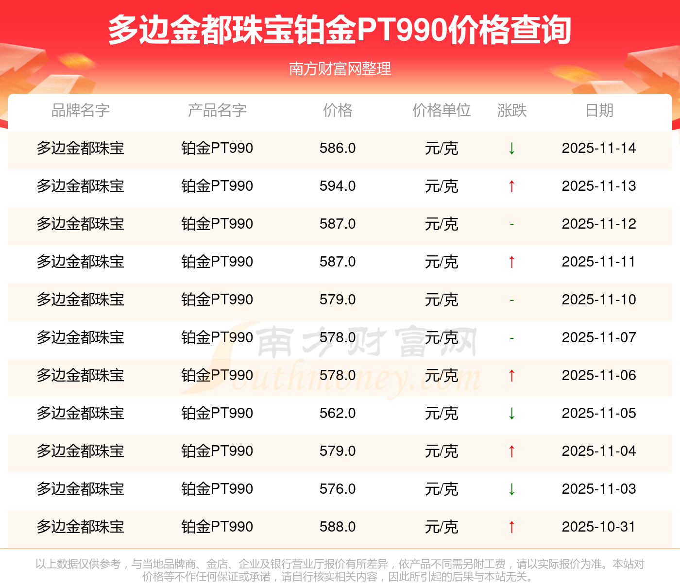 今日(2025年11月15日)多边金都珠宝铂金PT990价格为586.0元/克。