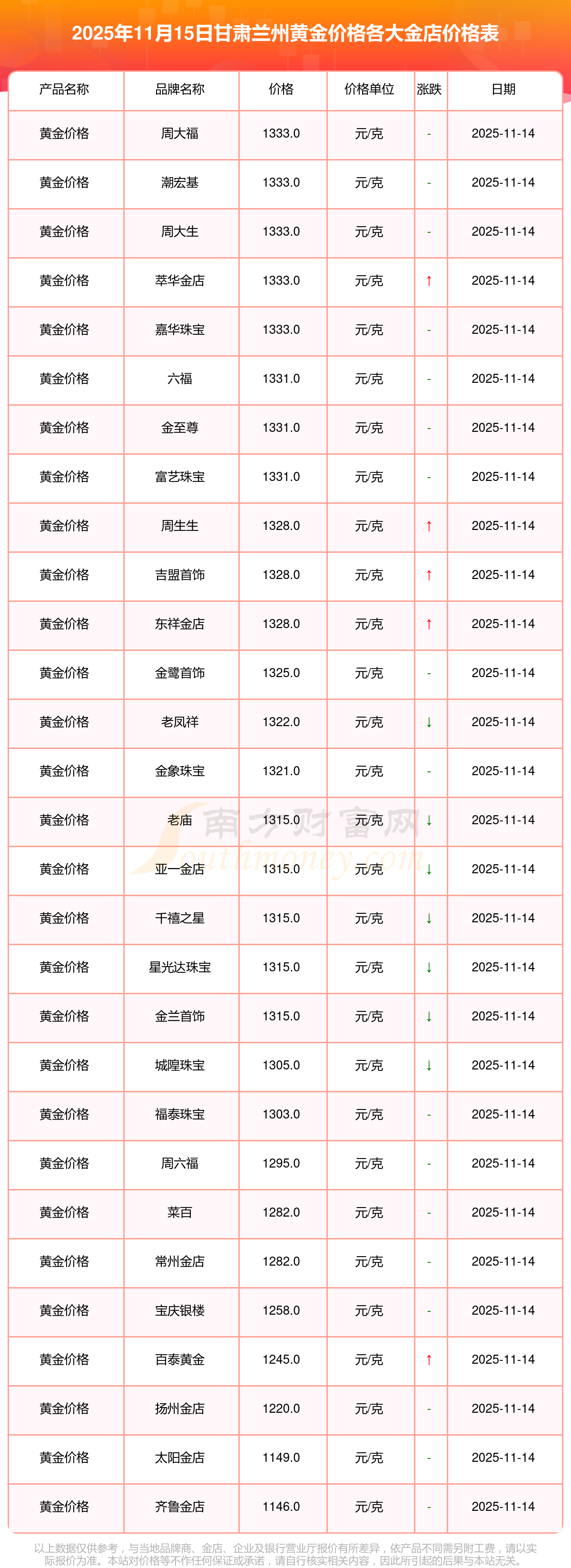 2025年11月15日,甘肃兰州周大福、周大福、周大福、周大福、周大福、周大福、周大福、老凤祥、老凤祥、老凤祥、周六福等各大金店品牌黄金价格今日价格行情最新来了:周大福1333.0元/克、周大福646.0元/克、周大福1333.0元/克、周大福46320.0、周大福18410.0、周大福41780.0、周大福1167.0元/克、老凤祥1322.0元/克、老凤祥600.0元/克、老凤祥1322.0元/克、周六福1295.0元/克。