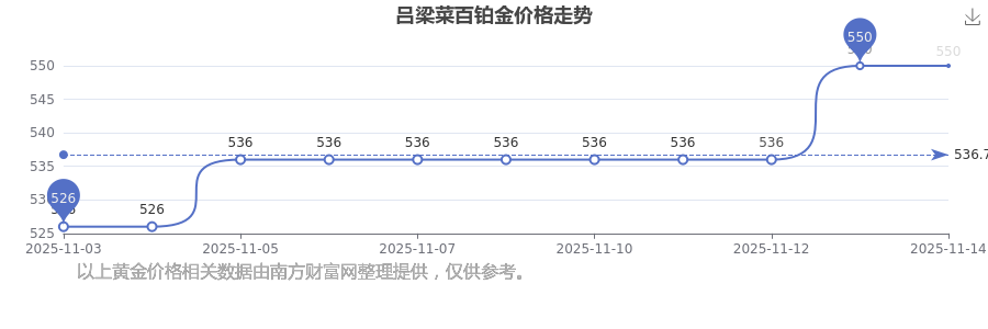 吕梁菜百在 2025年11月15日,铂金价格的售卖价格是 550.0元/克。