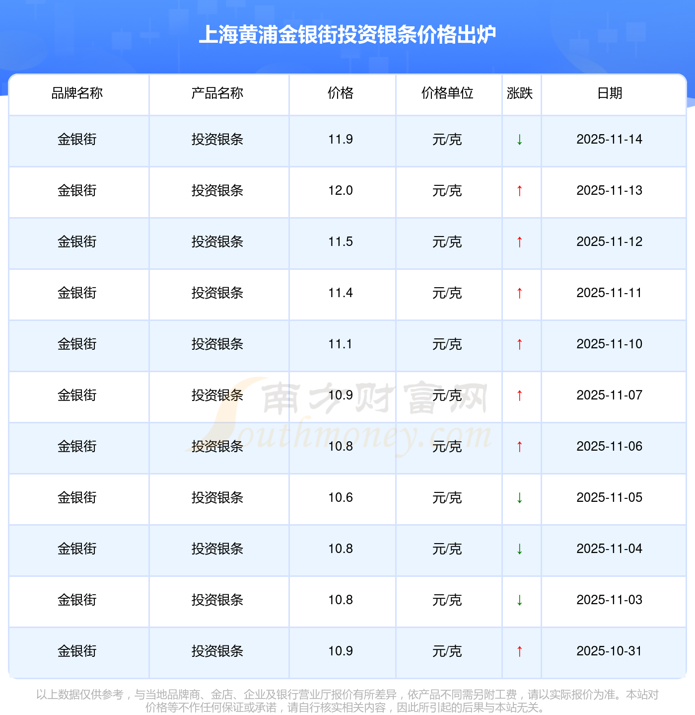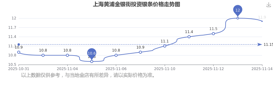 上海黄浦金银街 2025年11月15日的投资银条价位为 11.9元/克。