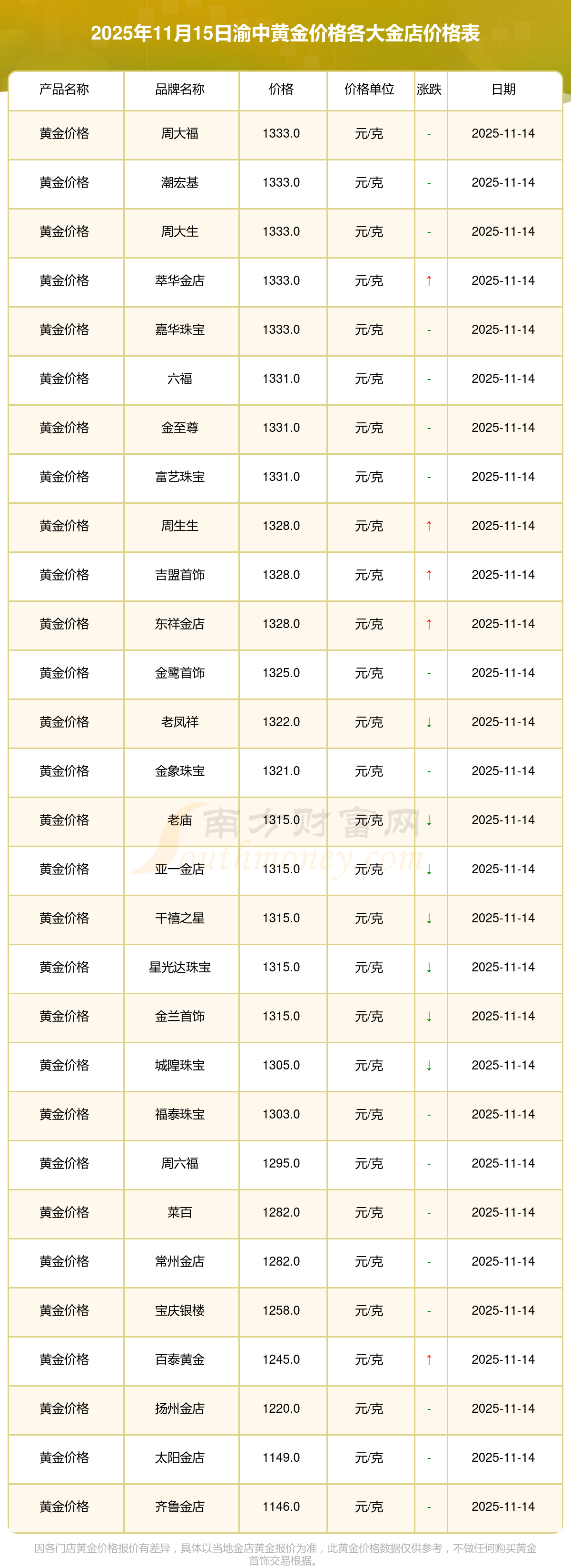 2025年11月15日,渝中周大福、周大福、周大福、周大福、周大福、周大福、周大福、老凤祥、老凤祥、老凤祥、周六福等各大金店品牌黄金价格今日价格如下:周大福1333.0元/克、周大福646.0元/克、周大福1333.0元/克、周大福46320.0、周大福18410.0、周大福41780.0、周大福1167.0元/克、老凤祥1322.0元/克、老凤祥600.0元/克、老凤祥1322.0元/克、周六福1295.0元/克。