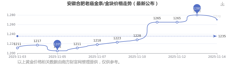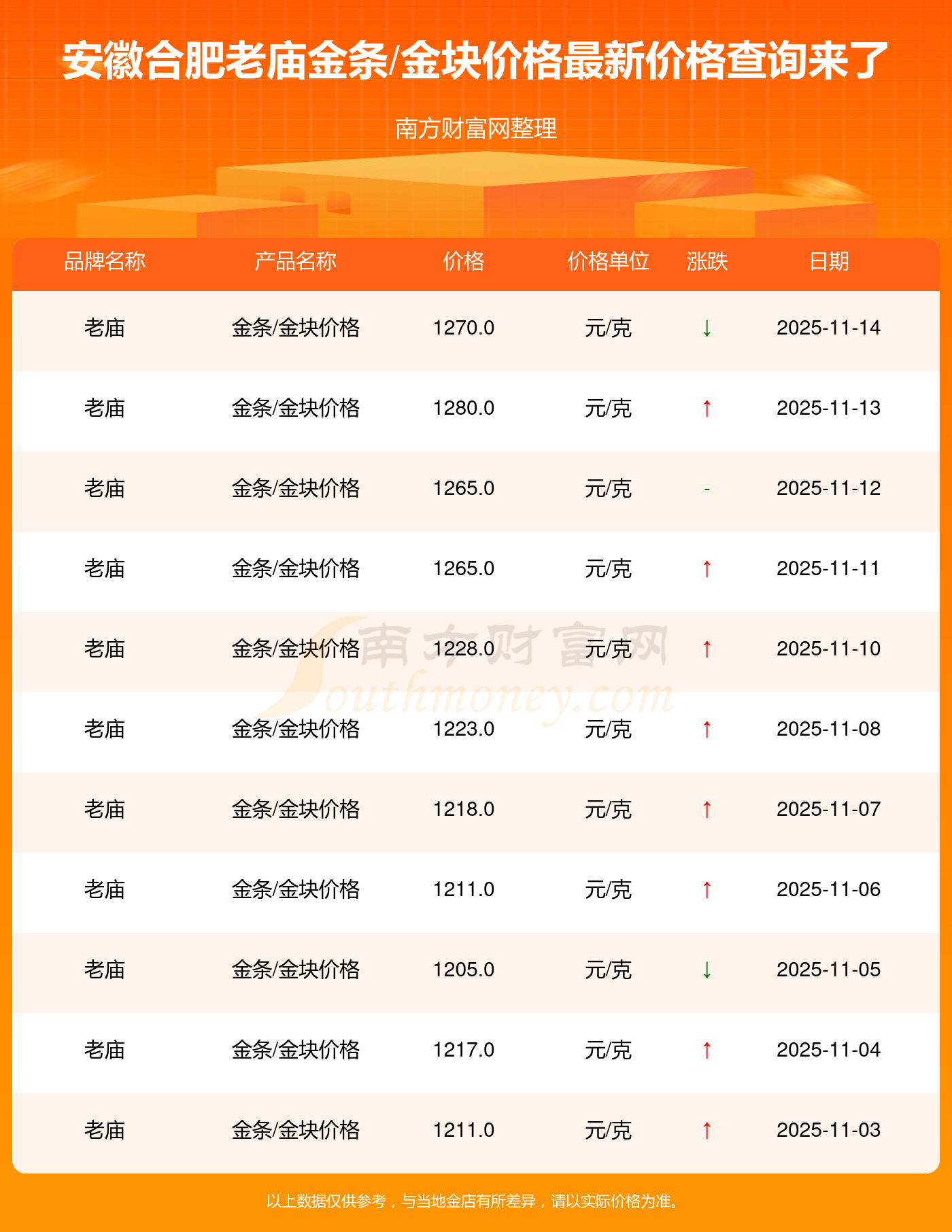 (2025年11月15日)今日安徽合肥老庙金条/金块价格是1270.0元/克。