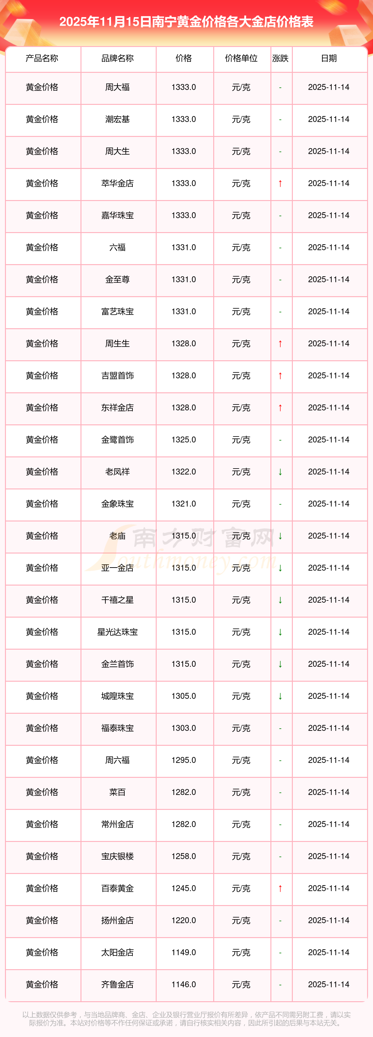 今天是2025年11月15日,南宁周大福、周大福、周大福、周大福、周大福、周大福、周大福、老凤祥、老凤祥、老凤祥、周六福等各大金店品牌黄金价格最新价格如下:周大福1333.0元/克、周大福646.0元/克、周大福1333.0元/克、周大福46320.0、周大福18410.0、周大福41780.0、周大福1167.0元/克、老凤祥1322.0元/克、老凤祥600.0元/克、老凤祥1322.0元/克、周六福1295.0元/克。