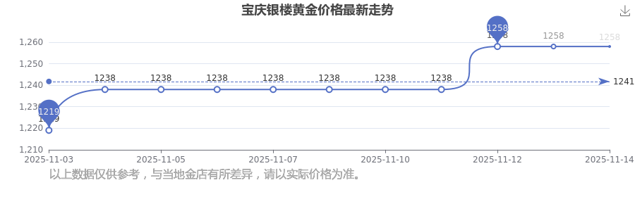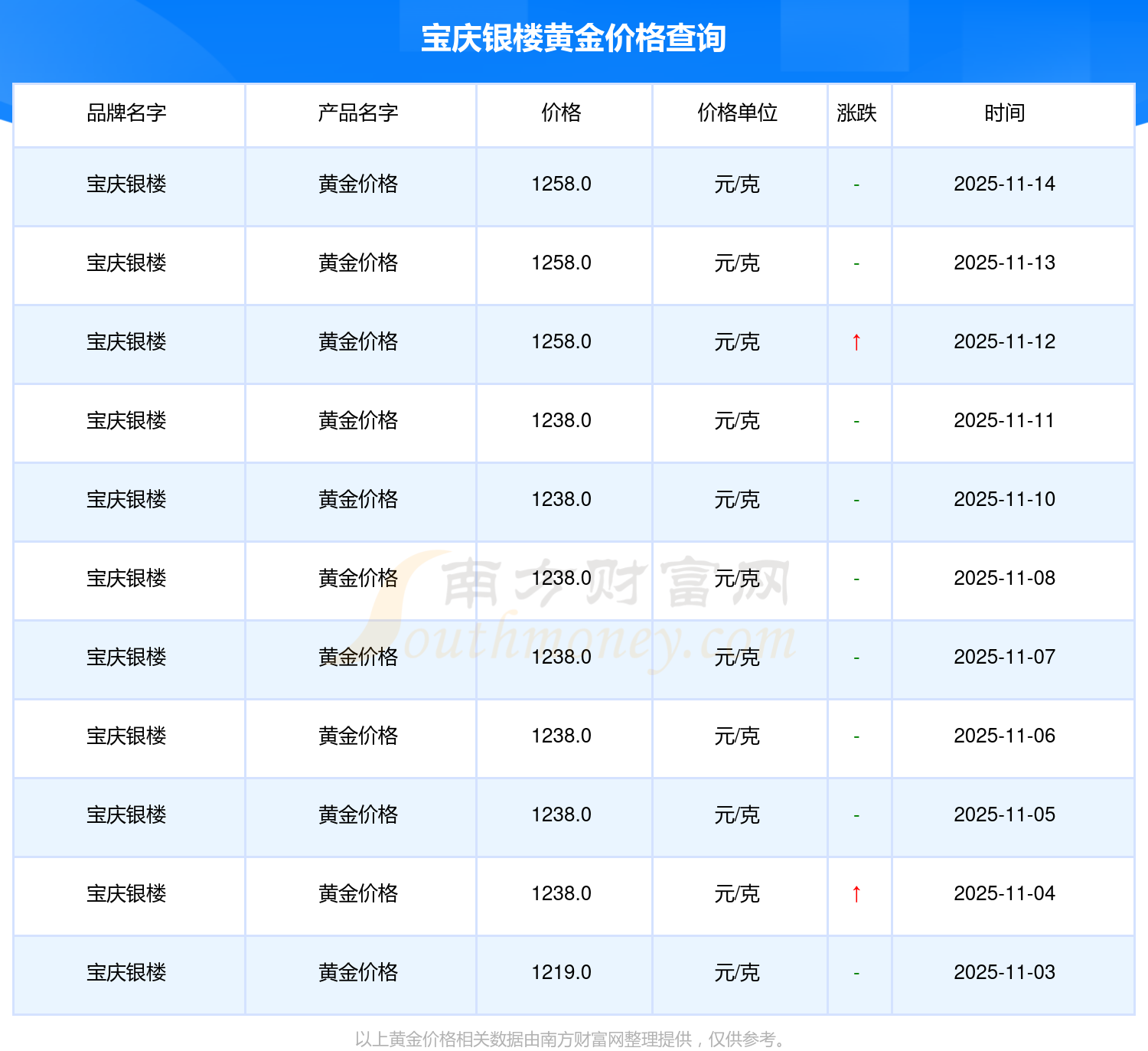 今日黄金价格查询_现在金价黄金一克多少钱,黄金价格是多少钱一克?黄金每一克的价格通常在多少数值左右?今日(2025年11月15日),宝庆银楼黄金价格最新价格是1258.0元/克。