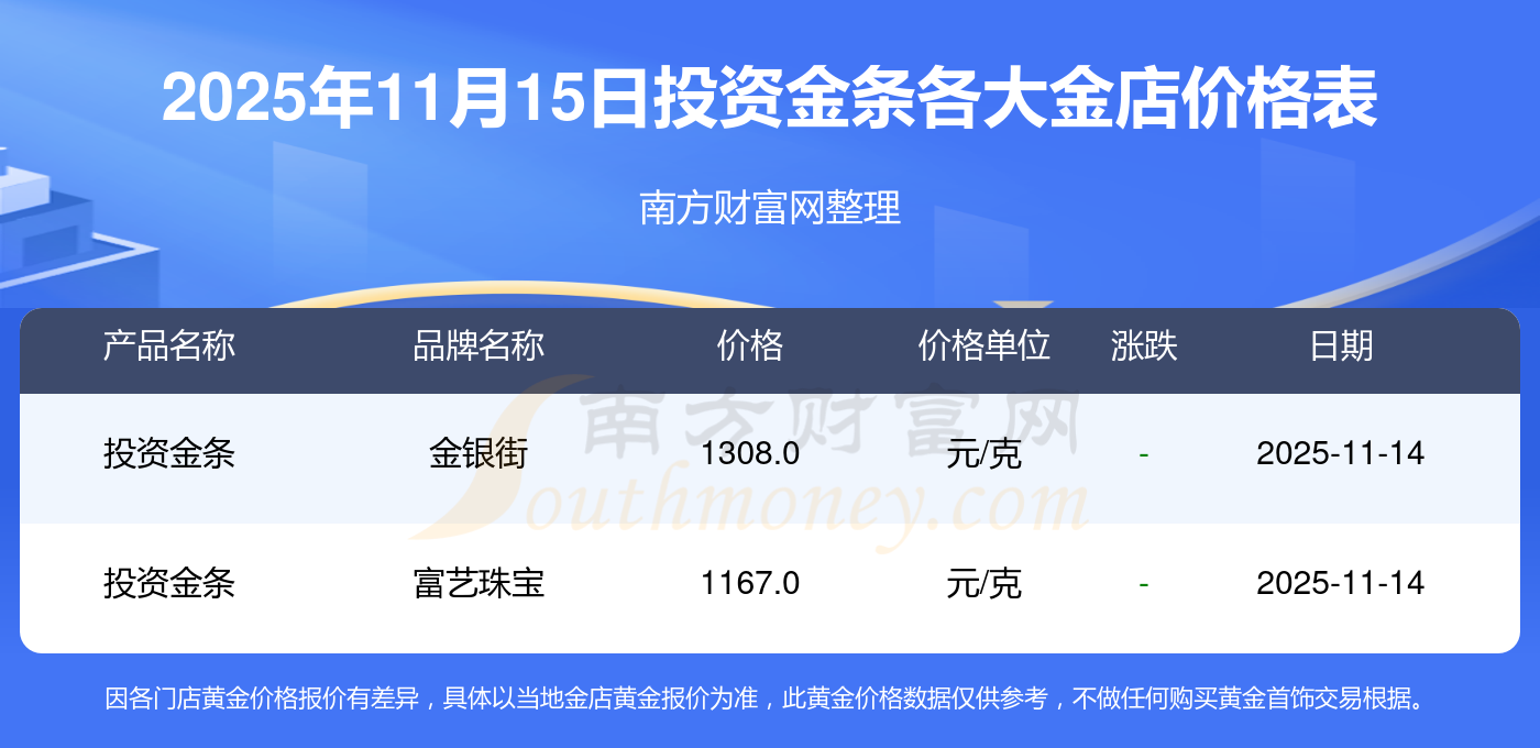 2025年11月15日周大福、周大福、周大福、周大福、周大福、周大福、周大福、老凤祥、老凤祥、老凤祥、周六福等各大金店品牌投资金条最新价格如下:周大福黄金价格1333.0元/克,周大福铂金价格646.0元/克,周大福饰品金价(内地)1333.0元/克,周大福黄金饰品(香港)46320.0,周大福铂金价格(香港)18410.0,周大福金条价格(香港)41780.0,周大福金条金价(内地)1167.0元/克,老凤祥黄金价格1322.0元/克,老凤祥铂金价格600.0元/克,老凤祥足金价格1322.0元/克,周六福黄金价格1295.0元/克。