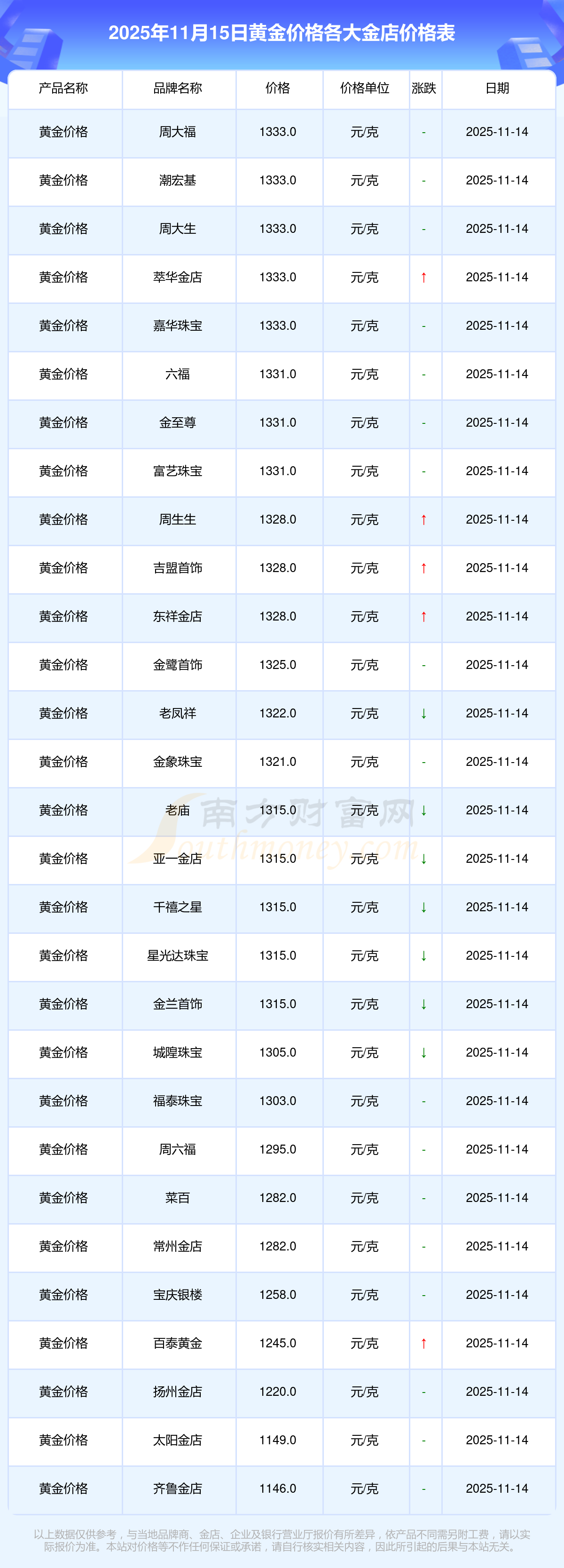 2025年11月15日,周大福、周大福、周大福、周大福、周大福、周大福、周大福、老凤祥、老凤祥、老凤祥、周六福等各大金店品牌黄金价格今日价格如下:周大福1333.0元/克、周大福646.0元/克、周大福1333.0元/克、周大福46320.0、周大福18410.0、周大福41780.0、周大福1167.0元/克、老凤祥1322.0元/克、老凤祥600.0元/克、老凤祥1322.0元/克、周六福1295.0元/克。