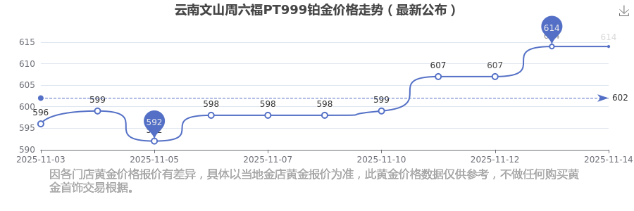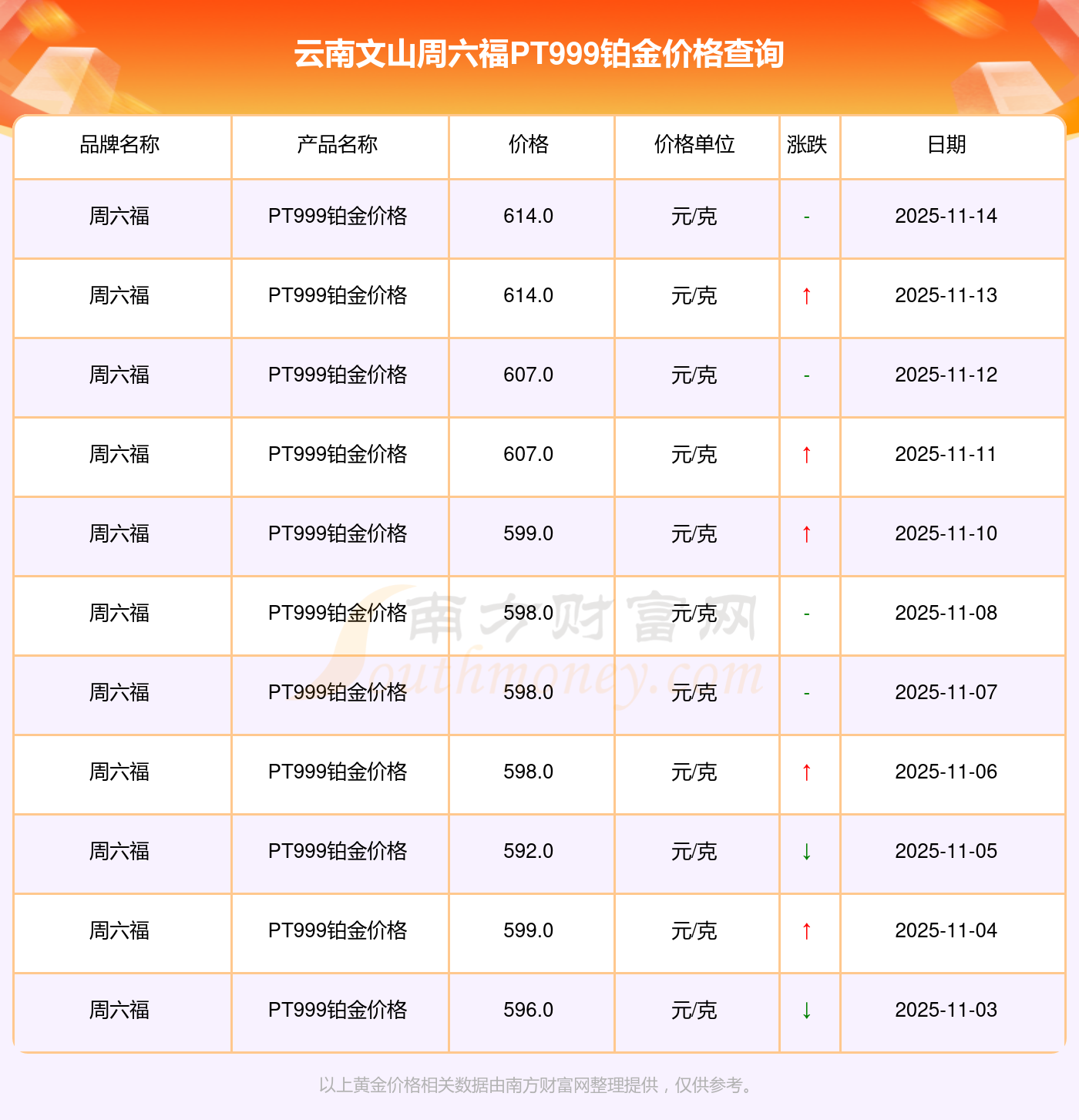 于 2025年11月15日,云南文山周六福PT999铂金价格的克价为614.0元/克。