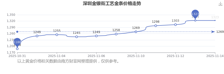 1323.0元/克,此乃深圳金银街于 2025年11月15日工艺金条的挂牌价格。