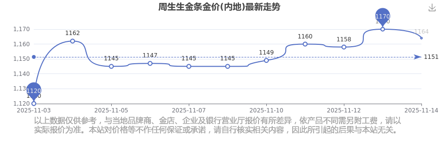 1164.0元/克是周生生在今日给出的 金条金价(内地)最新价格。