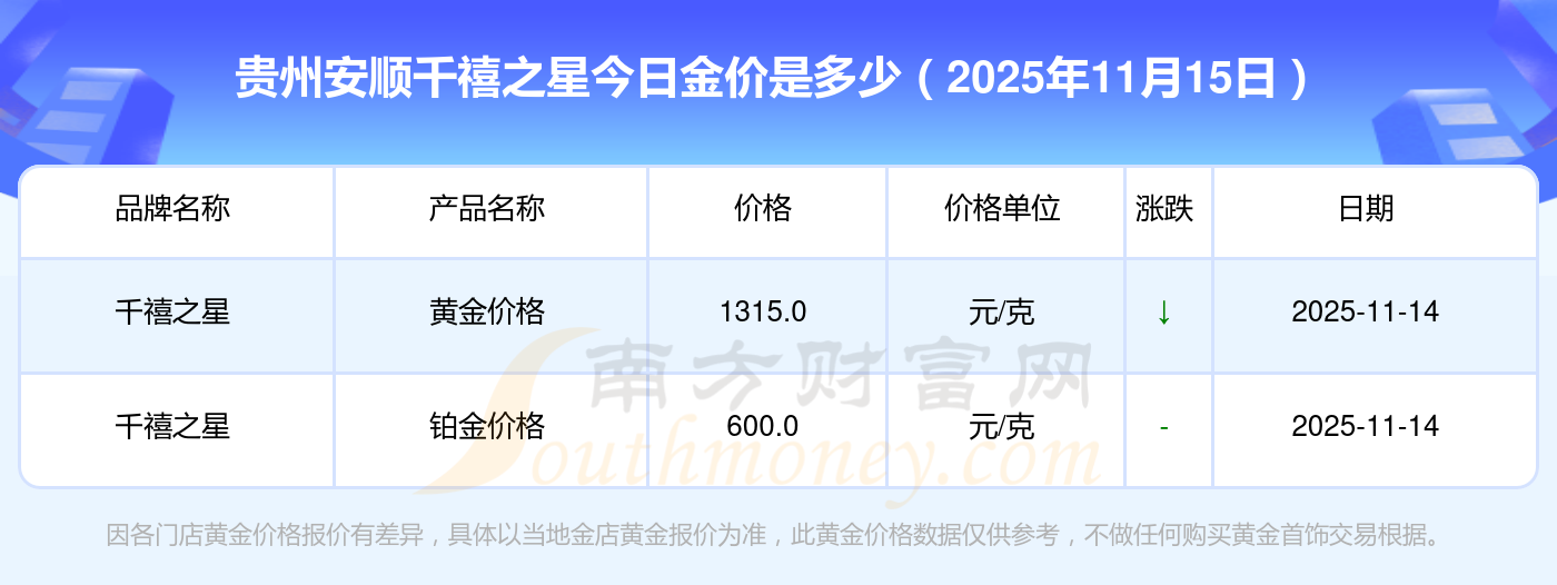 2025年11月15日贵州安顺千禧之星黄金按克计价,现在多少钱一克?黄金价格1333.0元/克,铂金价格646.0元/克,饰品金价(内地)1333.0元/克,黄金饰品(香港)46320.0,铂金价格(香港)18410.0,金条价格(香港)41780.0,金条金价(内地)1167.0元/克,黄金价格1322.0元/克,铂金价格600.0元/克,足金价格1322.0元/克,黄金价格1295.0元/克。