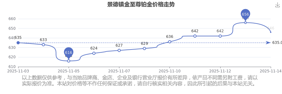 今日(2025年11月15日)景德镇金至尊铂金价格:646.0元/克。