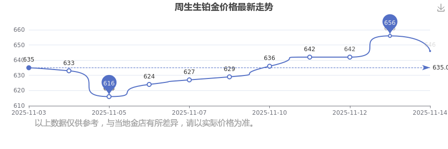 目前周生生 铂金价格的价格,今日最新为646.0元/克。