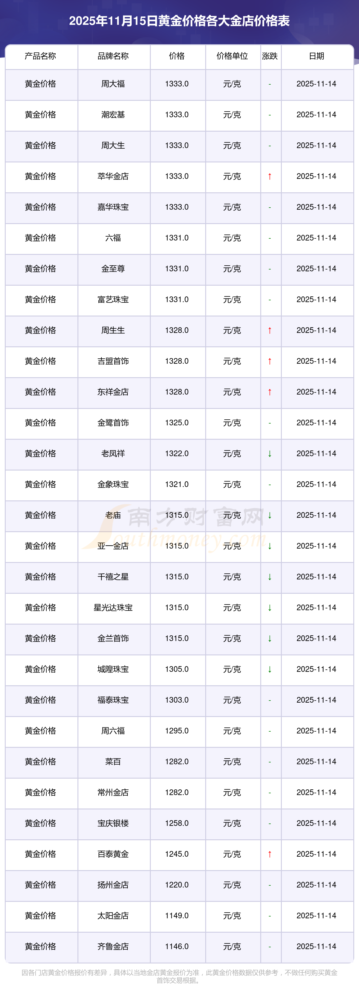 今天是2025年11月15日,周大福、周大福、周大福、周大福、周大福、周大福、周大福、老凤祥、老凤祥、老凤祥、周六福等各大金店品牌黄金价格最新价格如下:周大福1333.0元/克、周大福646.0元/克、周大福1333.0元/克、周大福46320.0、周大福18410.0、周大福41780.0、周大福1167.0元/克、老凤祥1322.0元/克、老凤祥600.0元/克、老凤祥1322.0元/克、周六福1295.0元/克。