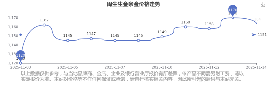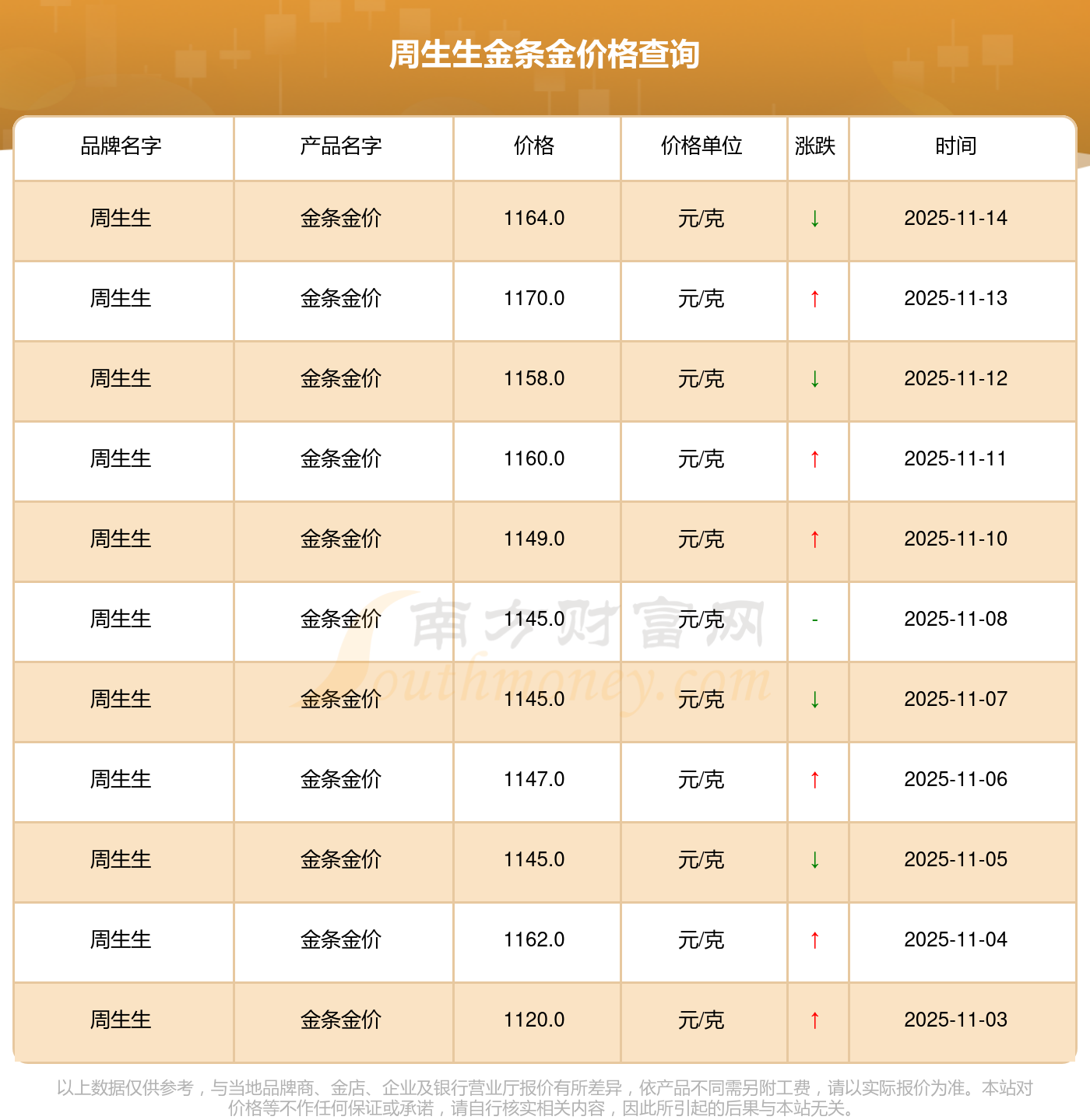目前周生生 金条金价的价格,今日最新为1164.0元/克。