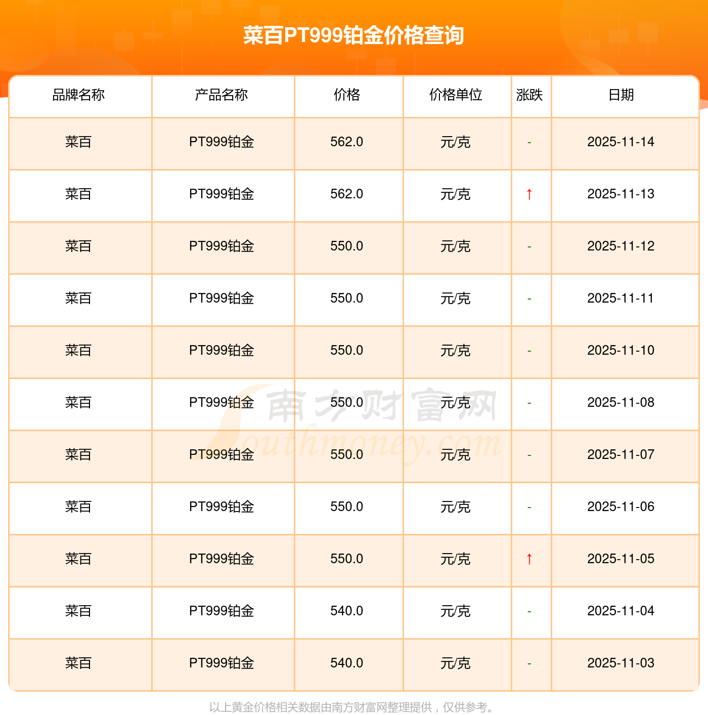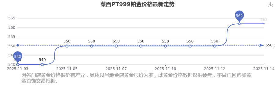 今日(2025年11月15日)菜百PT999铂金价格是562.0元/克。