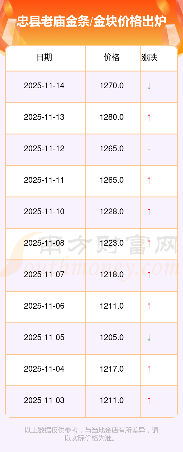2025年11月15日,忠县老庙金条/金块价格每克的售卖价位为1270.0元/克。