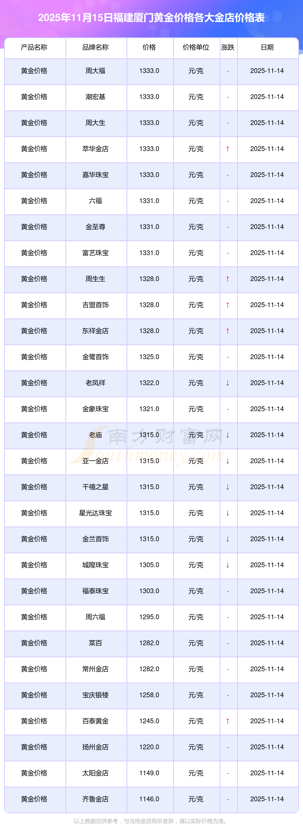 今天是2025年11月15日,福建厦门周大福、周大福、周大福、周大福、周大福、周大福、周大福、老凤祥、老凤祥、老凤祥、周六福等各大金店品牌黄金价格最新价格如下:周大福1333.0元/克、周大福646.0元/克、周大福1333.0元/克、周大福46320.0、周大福18410.0、周大福41780.0、周大福1167.0元/克、老凤祥1322.0元/克、老凤祥600.0元/克、老凤祥1322.0元/克、周六福1295.0元/克。
