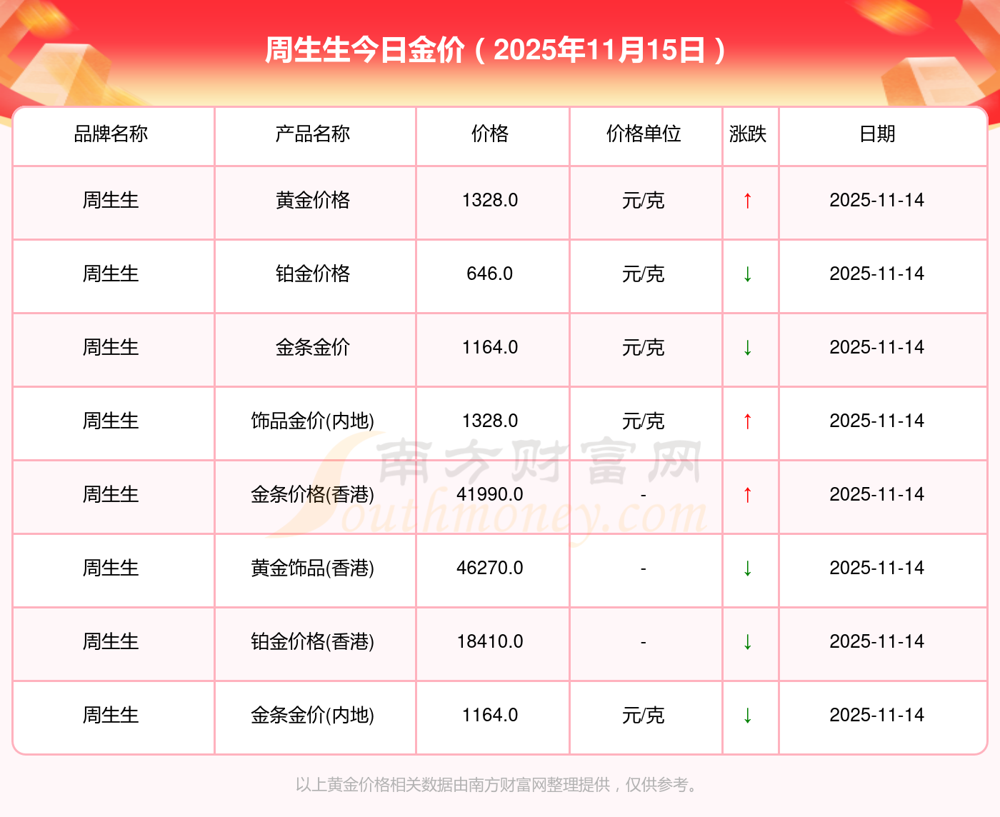 今天是2025年11月15日,周大福、周大福、周大福、周大福、周大福、周大福、周大福、老凤祥、老凤祥、老凤祥、周六福等各大金店品牌黄金价格最新价格如下:周大福1333.0元/克、周大福646.0元/克、周大福1333.0元/克、周大福46320.0、周大福18410.0、周大福41780.0、周大福1167.0元/克、老凤祥1322.0元/克、老凤祥600.0元/克、老凤祥1322.0元/克、周六福1295.0元/克。