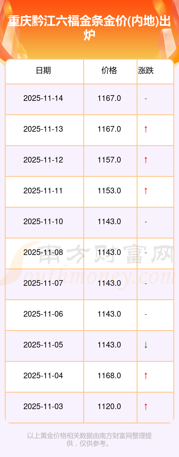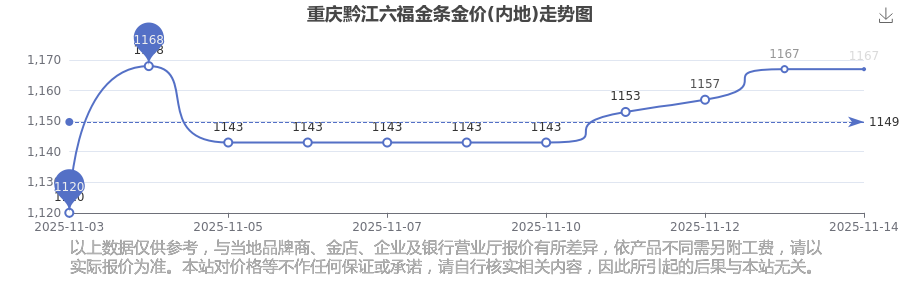 今日(2025年11月15日),重庆黔江六福金条金价(内地):1167.0元/克。