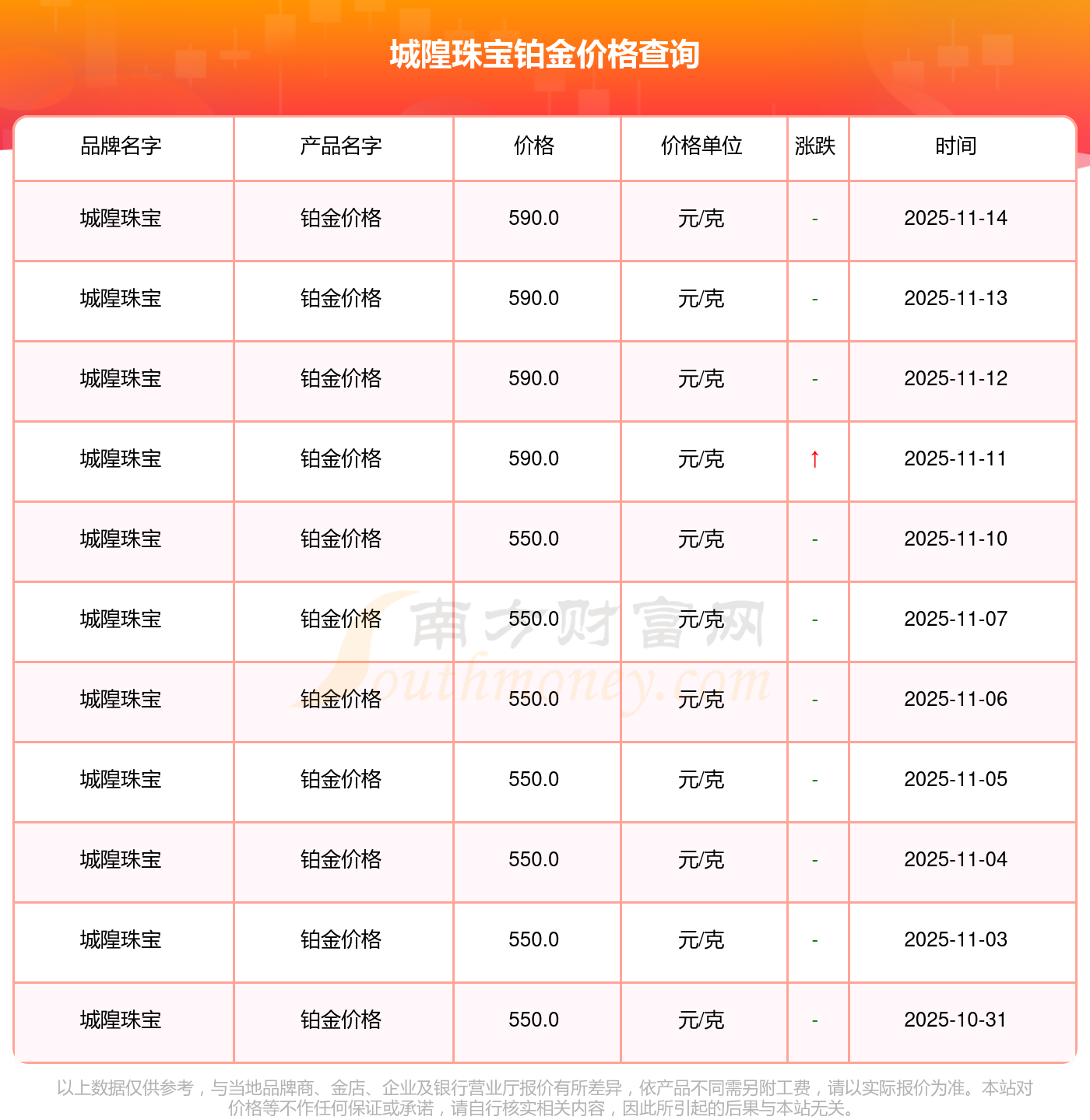 590.0元/克是城隍珠宝在今日给出的 铂金价格最新价格。