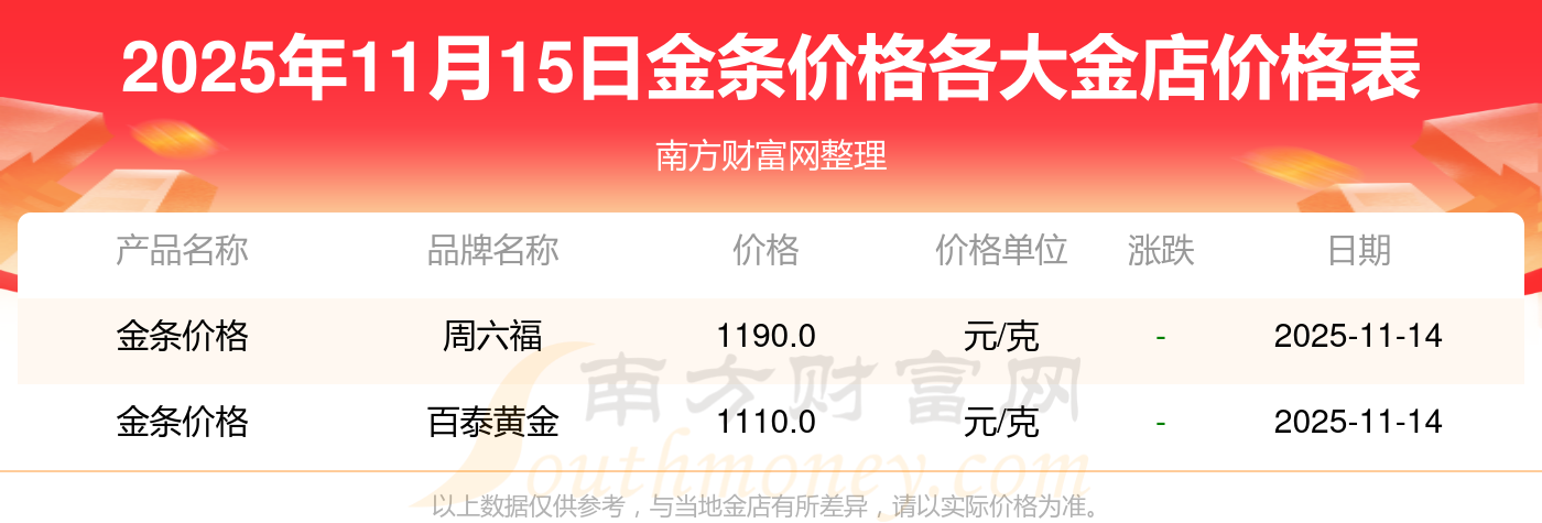 2025年11月15日各大金店金条价格最新价格:周大福1333.0元/克,周大福646.0元/克,周大福1333.0元/克,周大福46320.0,周大福18410.0,周大福41780.0,周大福1167.0元/克,老凤祥1322.0元/克,老凤祥600.0元/克,老凤祥1322.0元/克,周六福1295.0元/克。