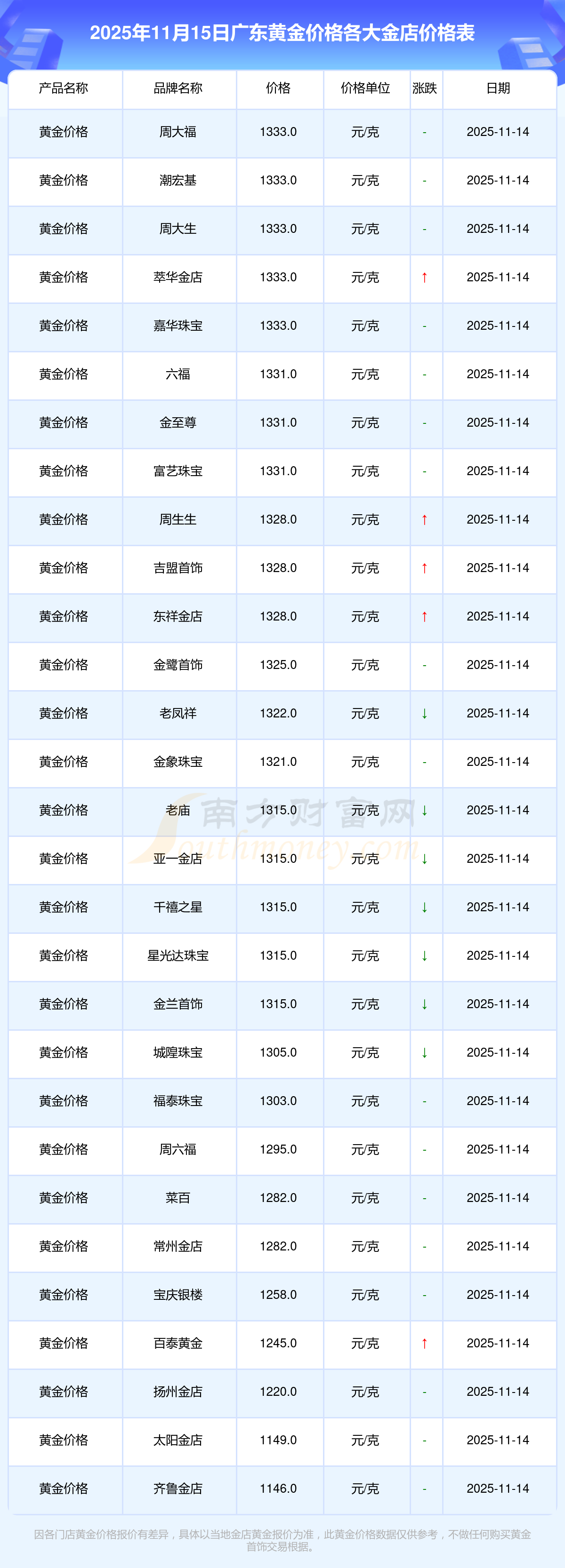 今天是2025年11月15日,广东周大福、周大福、周大福、周大福、周大福、周大福、周大福、老凤祥、老凤祥、老凤祥、周六福等各大金店品牌黄金价格最新价格如下:周大福1333.0元/克、周大福646.0元/克、周大福1333.0元/克、周大福46320.0、周大福18410.0、周大福41780.0、周大福1167.0元/克、老凤祥1322.0元/克、老凤祥600.0元/克、老凤祥1322.0元/克、周六福1295.0元/克。
