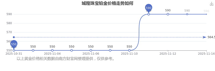 今日城隍珠宝 铂金价格最新的克重售价为590.0元/克。