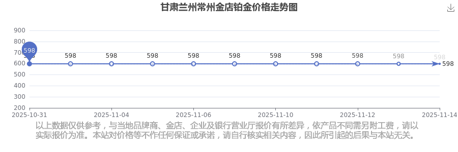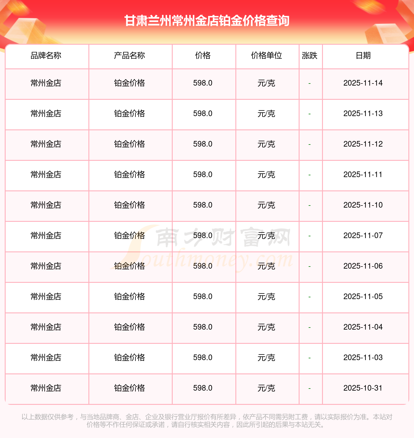 2025年11月15日,甘肃兰州常州金店的铂金价格标价达到 598.0元/克。