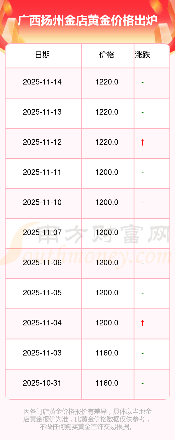 2025年11月15日周大福、周大福、周大福、周大福、周大福、周大福、周大福、老凤祥、老凤祥、老凤祥、周六福等各大金店品牌黄金价格最新价格如下:周大福黄金价格1333.0元/克,周大福铂金价格646.0元/克,周大福饰品金价(内地)1333.0元/克,周大福黄金饰品(香港)46320.0,周大福铂金价格(香港)18410.0,周大福金条价格(香港)41780.0,周大福金条金价(内地)1167.0元/克,老凤祥黄金价格1322.0元/克,老凤祥铂金价格600.0元/克,老凤祥足金价格1322.0元/克,周六福黄金价格1295.0元/克。