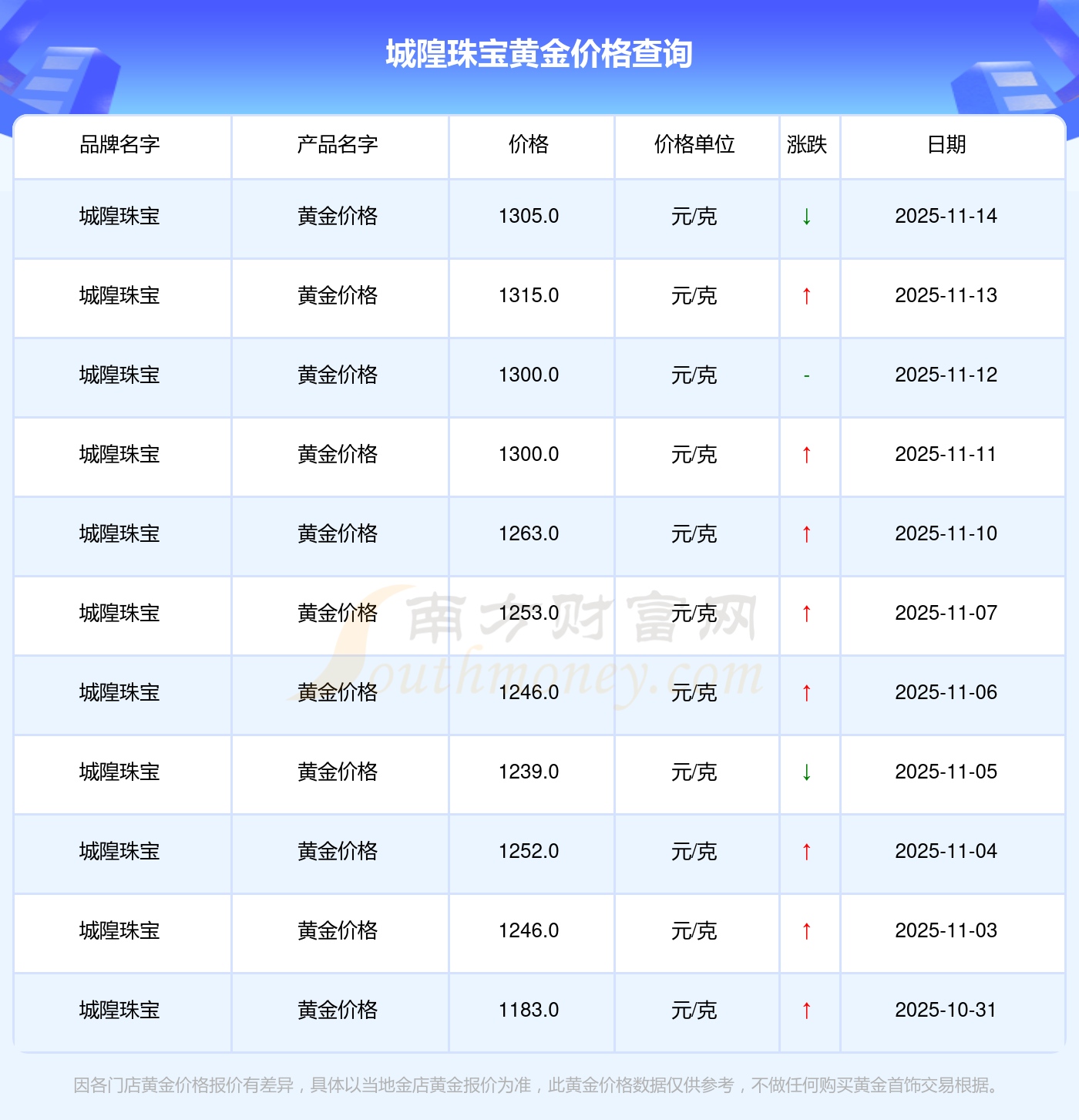 今日城隍珠宝 黄金价格最新的克重售价为1305.0元/克。