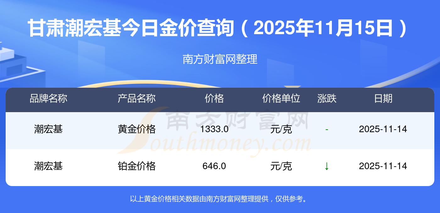 2025年11月15日甘肃潮宏基一克黄金的售价是多少:黄金价格1333.0元/克,铂金价格646.0元/克,饰品金价(内地)1333.0元/克,黄金饰品(香港)46320.0,铂金价格(香港)18410.0,金条价格(香港)41780.0,金条金价(内地)1167.0元/克,黄金价格1322.0元/克,铂金价格600.0元/克,足金价格1322.0元/克,黄金价格1295.0元/克。