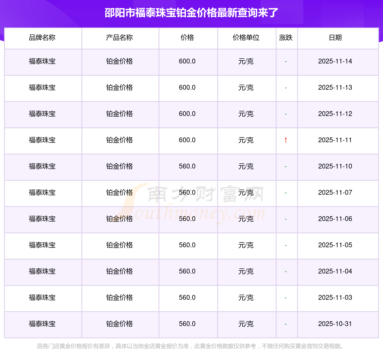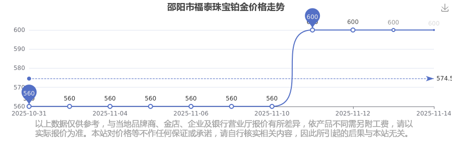 2025年11月15日邵阳市福泰珠宝铂金价格:600.0元/克。