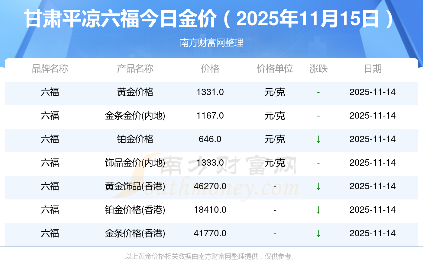 黄金价格1333.0元/克,铂金价格646.0元/克,饰品金价(内地)1333.0元/克,黄金饰品(香港)46320.0,铂金价格(香港)18410.0,金条价格(香港)41780.0,金条金价(内地)1167.0元/克,黄金价格1322.0元/克,铂金价格600.0元/克,足金价格1322.0元/克,黄金价格1295.0元/克。