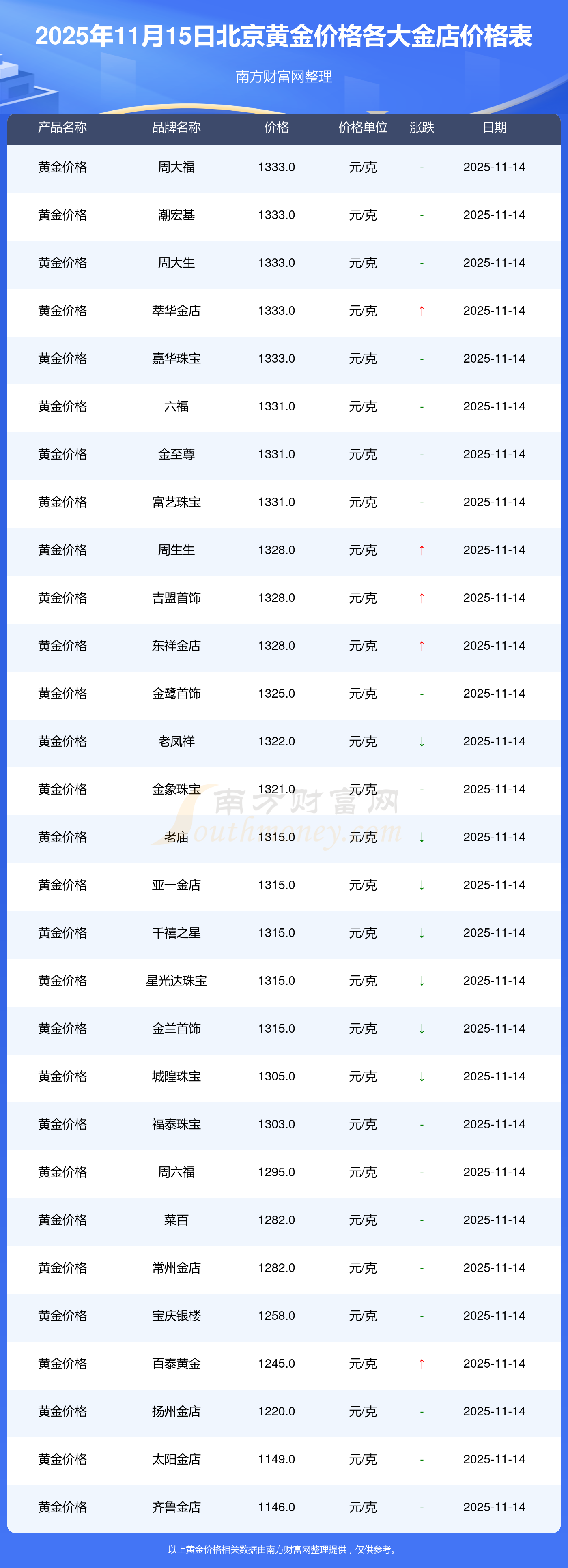 今天是2025年11月15日,北京周大福、周大福、周大福、周大福、周大福、周大福、周大福、老凤祥、老凤祥、老凤祥、周六福等各大金店品牌黄金价格最新价格行情是这样的:周大福1333.0元/克、周大福646.0元/克、周大福1333.0元/克、周大福46320.0、周大福18410.0、周大福41780.0、周大福1167.0元/克、老凤祥1322.0元/克、老凤祥600.0元/克、老凤祥1322.0元/克、周六福1295.0元/克。