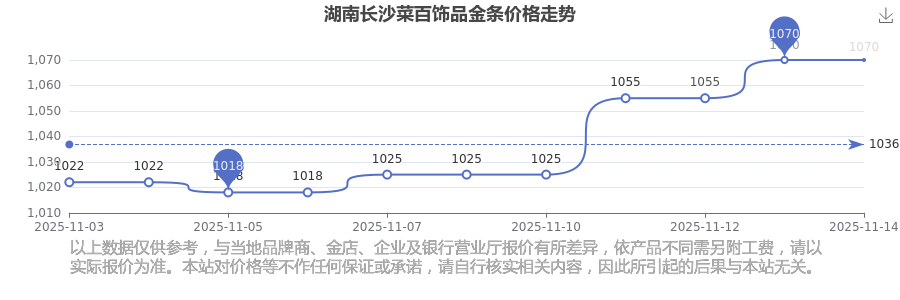 湖南长沙菜百在 2025年11月15日的饰品金条价格零售价格为 1070.0元/克。