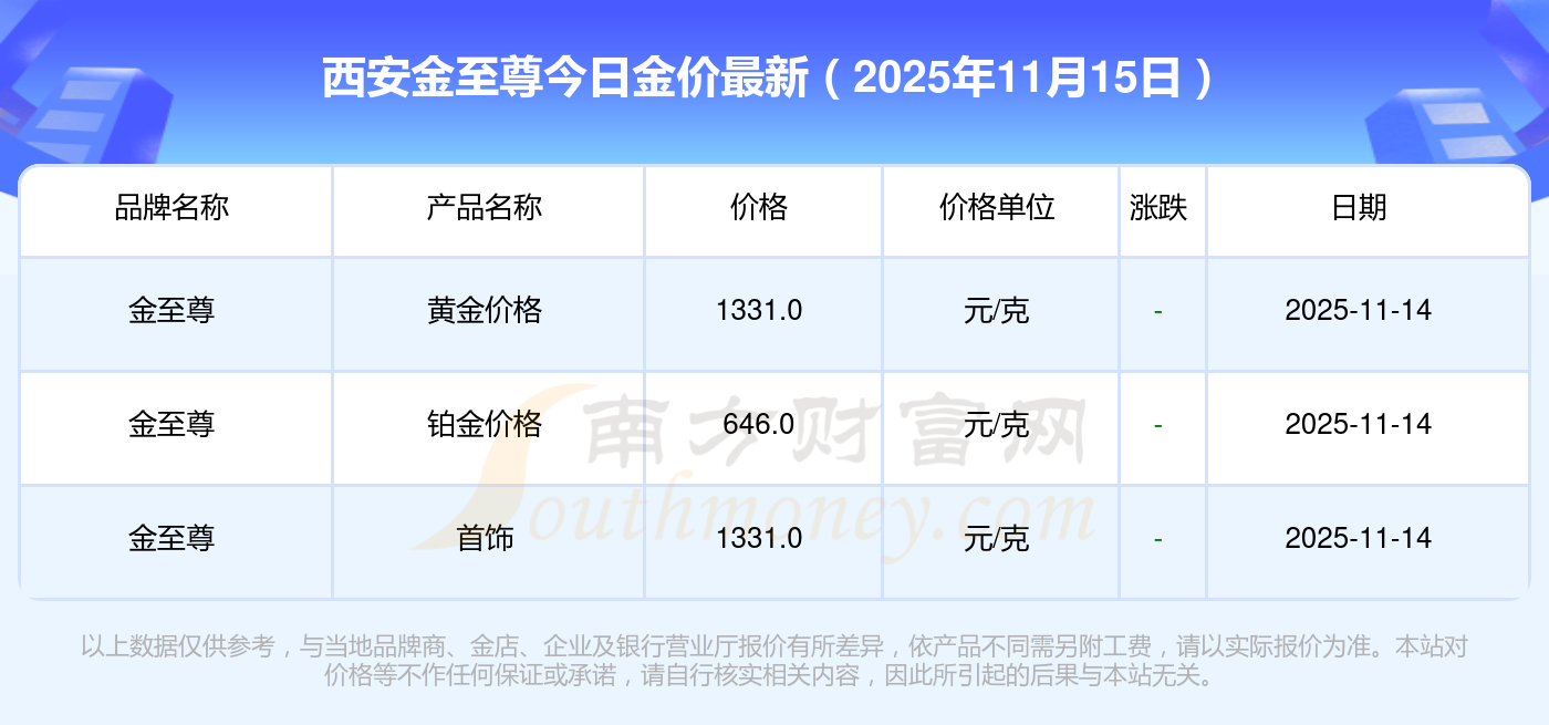 2025年11月15日西安金至尊每克黄金的市场价格是多少:黄金价格1333.0元/克,铂金价格646.0元/克,饰品金价(内地)1333.0元/克,黄金饰品(香港)46320.0,铂金价格(香港)18410.0,金条价格(香港)41780.0,金条金价(内地)1167.0元/克,黄金价格1322.0元/克,铂金价格600.0元/克,足金价格1322.0元/克,黄金价格1295.0元/克。
